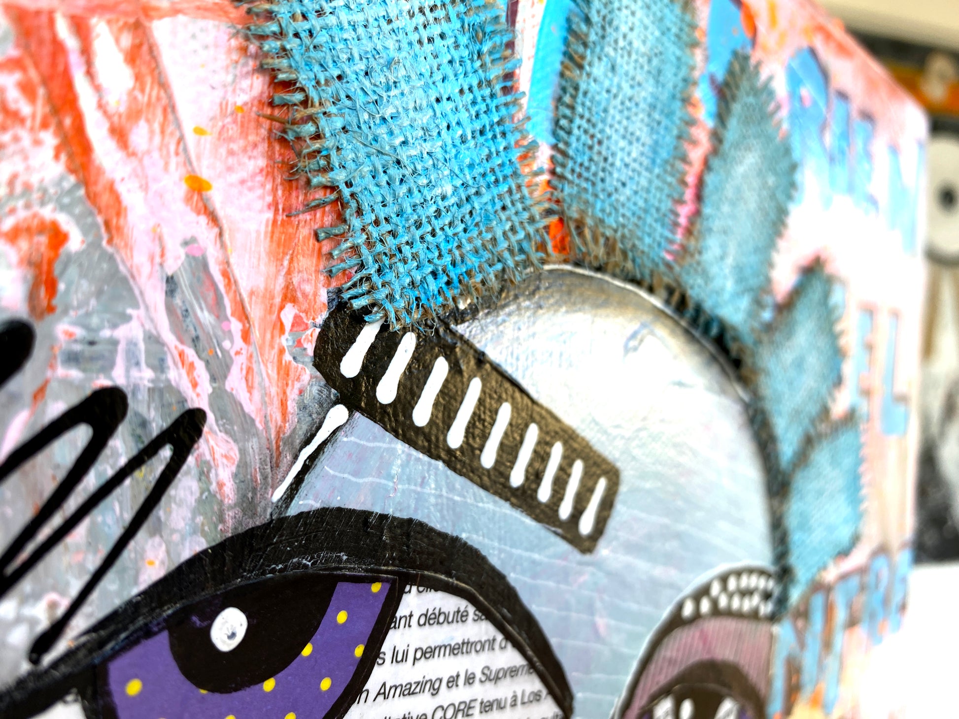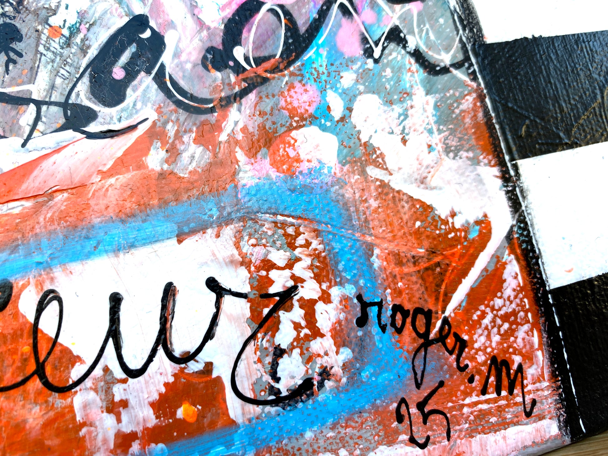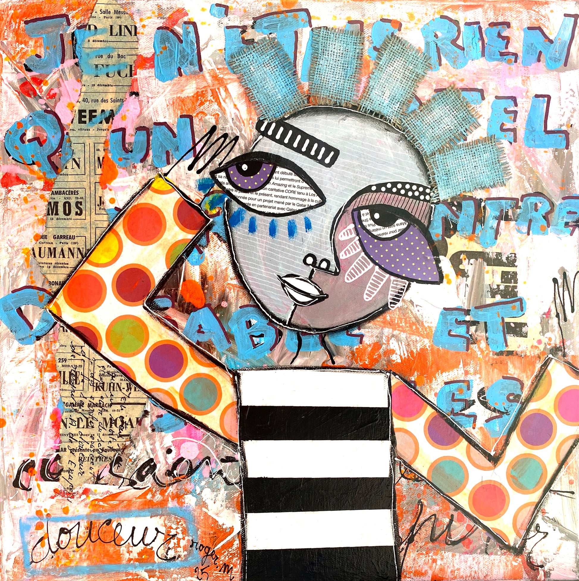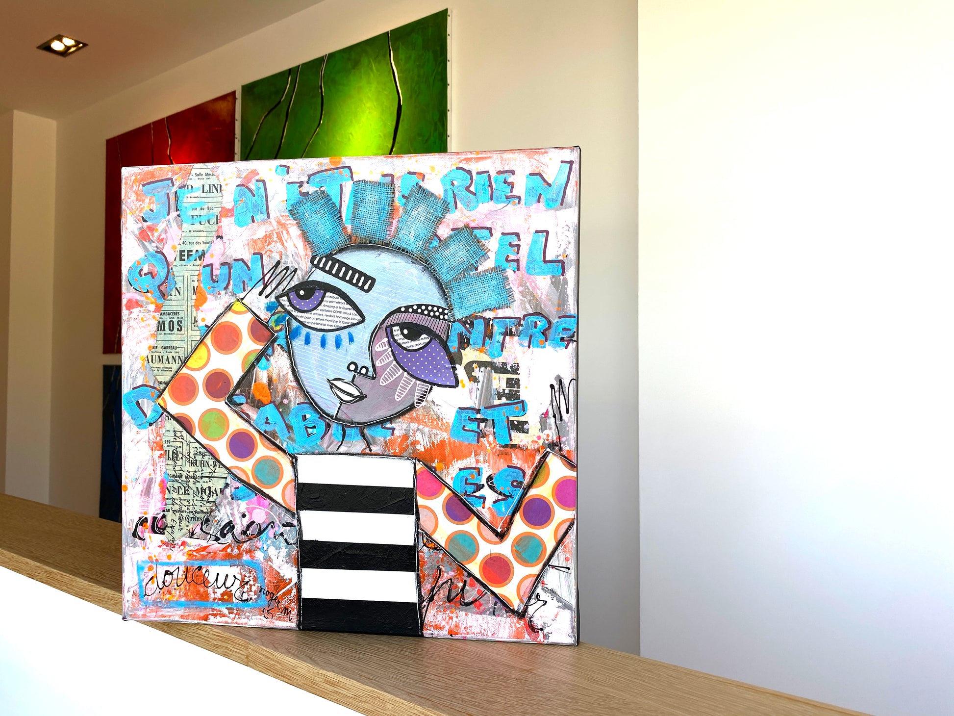 Roger M nous invite dans un univers où le chaos apparent de la matière se structure autour d'une figure centrale à la fois fragile et conquérante. Fidèle à son esthétique de technique mixte, l'artiste superpose les couches de sens et de textures pour explorer l'identité humaine.