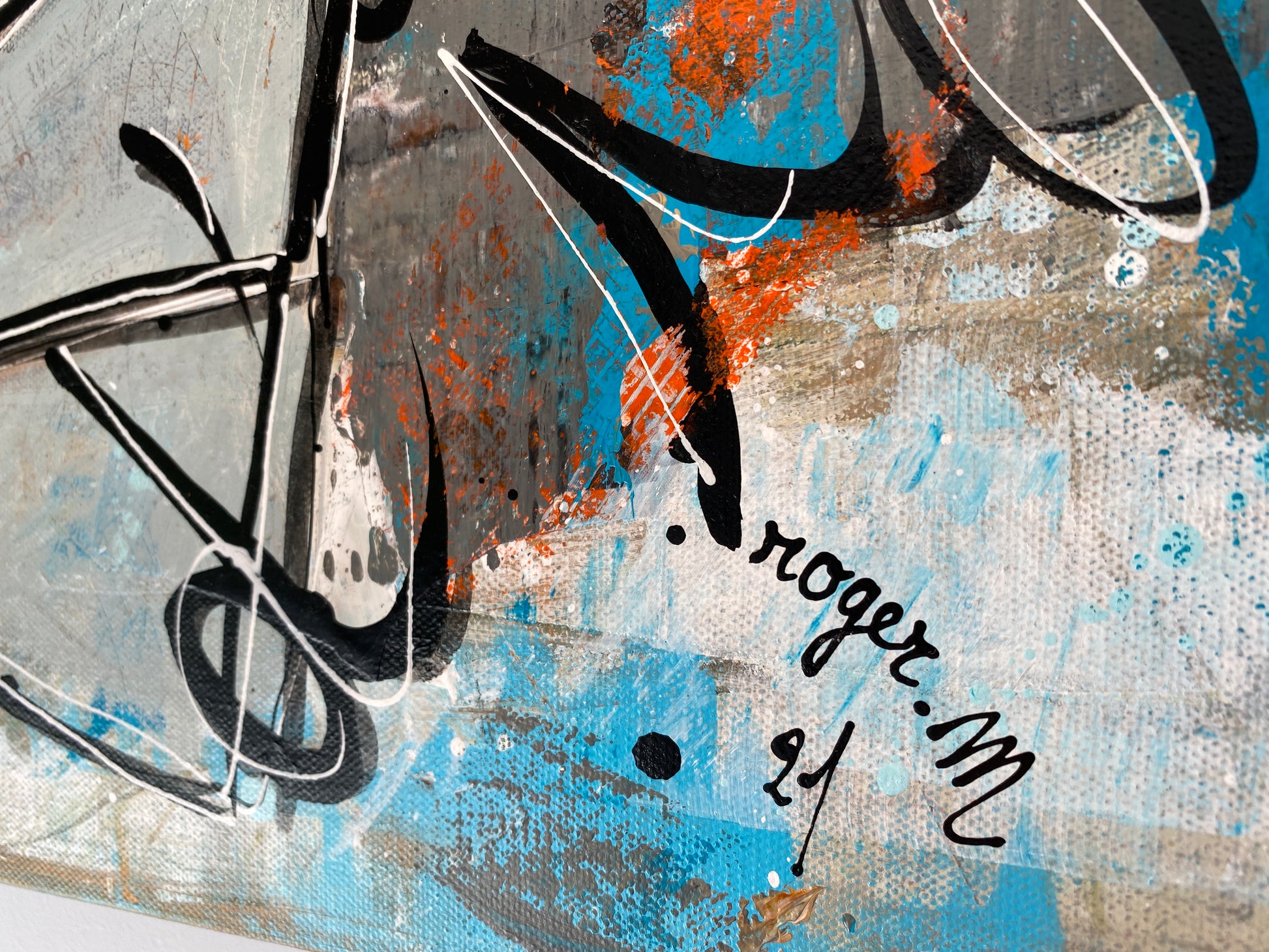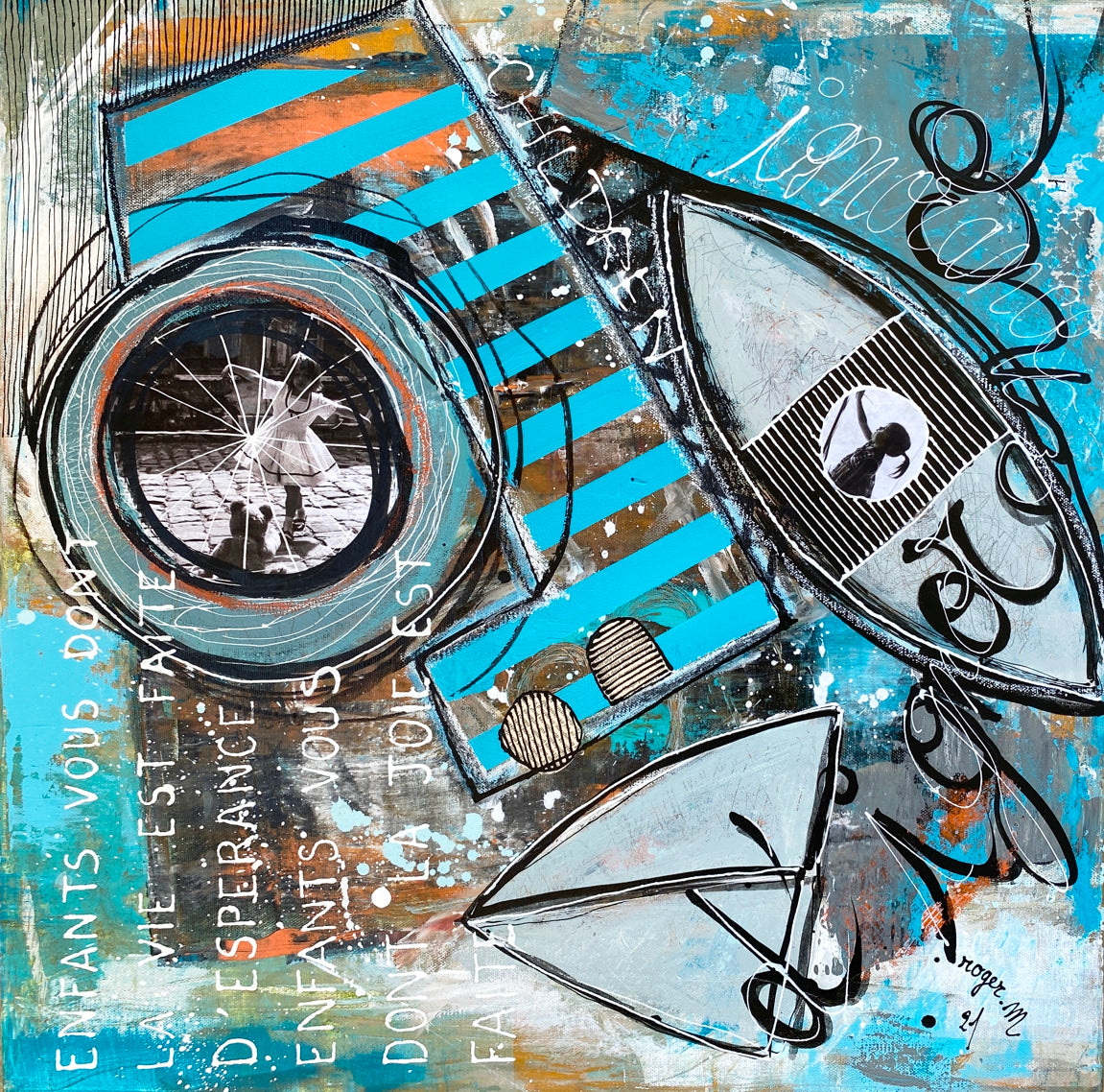L'œuvre dégage une vitalité et une fraîcheur indéniables. roger.M utilise le contraste entre le fond abstrait et les fragments figuratifs pour créer un dialogue entre le chaos du monde et la pureté de l'enfance.