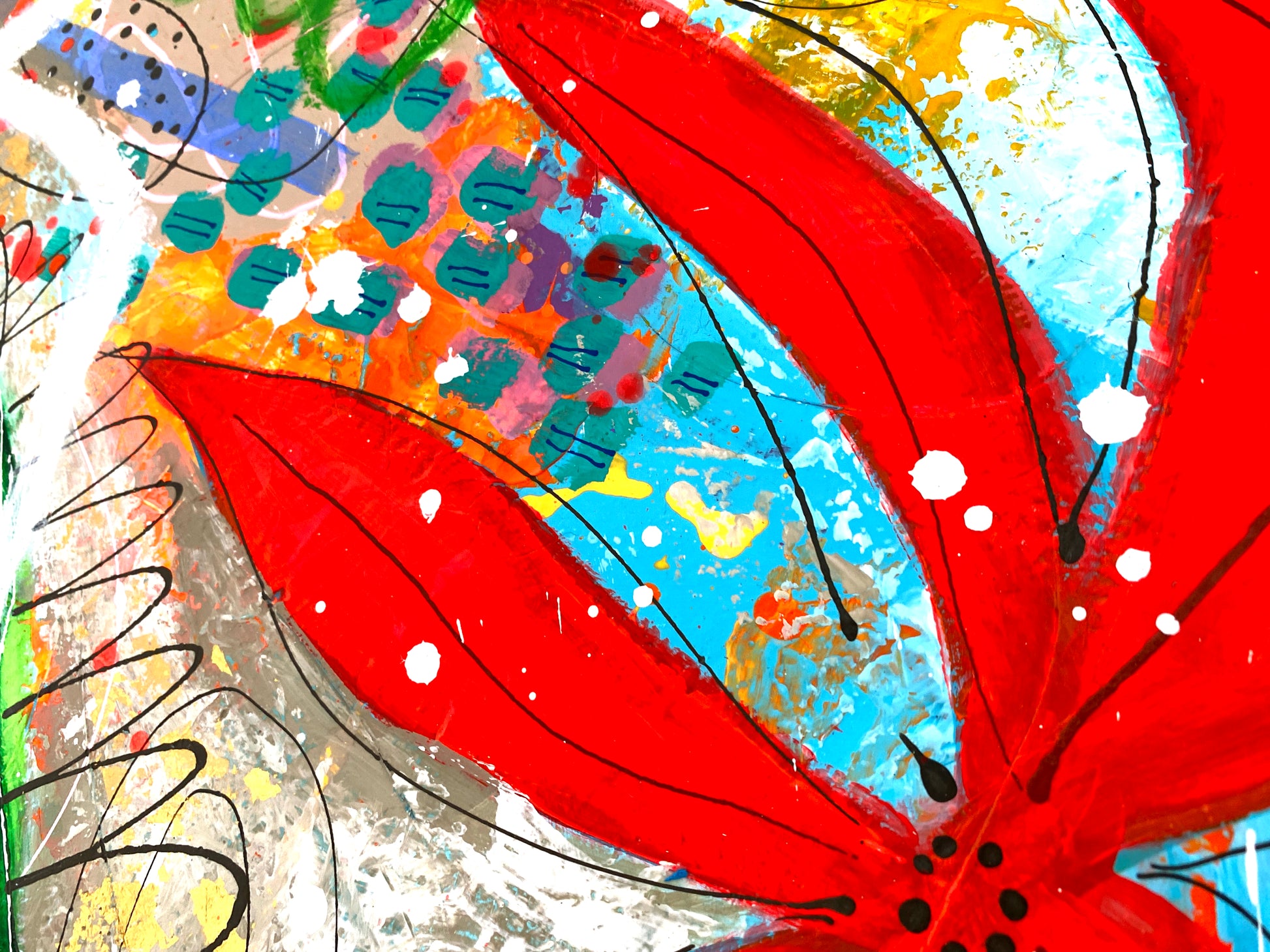 Roger M utilise le motif floral non pas comme une nature morte, mais comme un prétexte à la jubilation chromatique. Le graphisme noir, nerveux et hachuré, vient souligner les contours, donnant à l'ensemble une énergie "street art" tout en conservant une élégance organique.