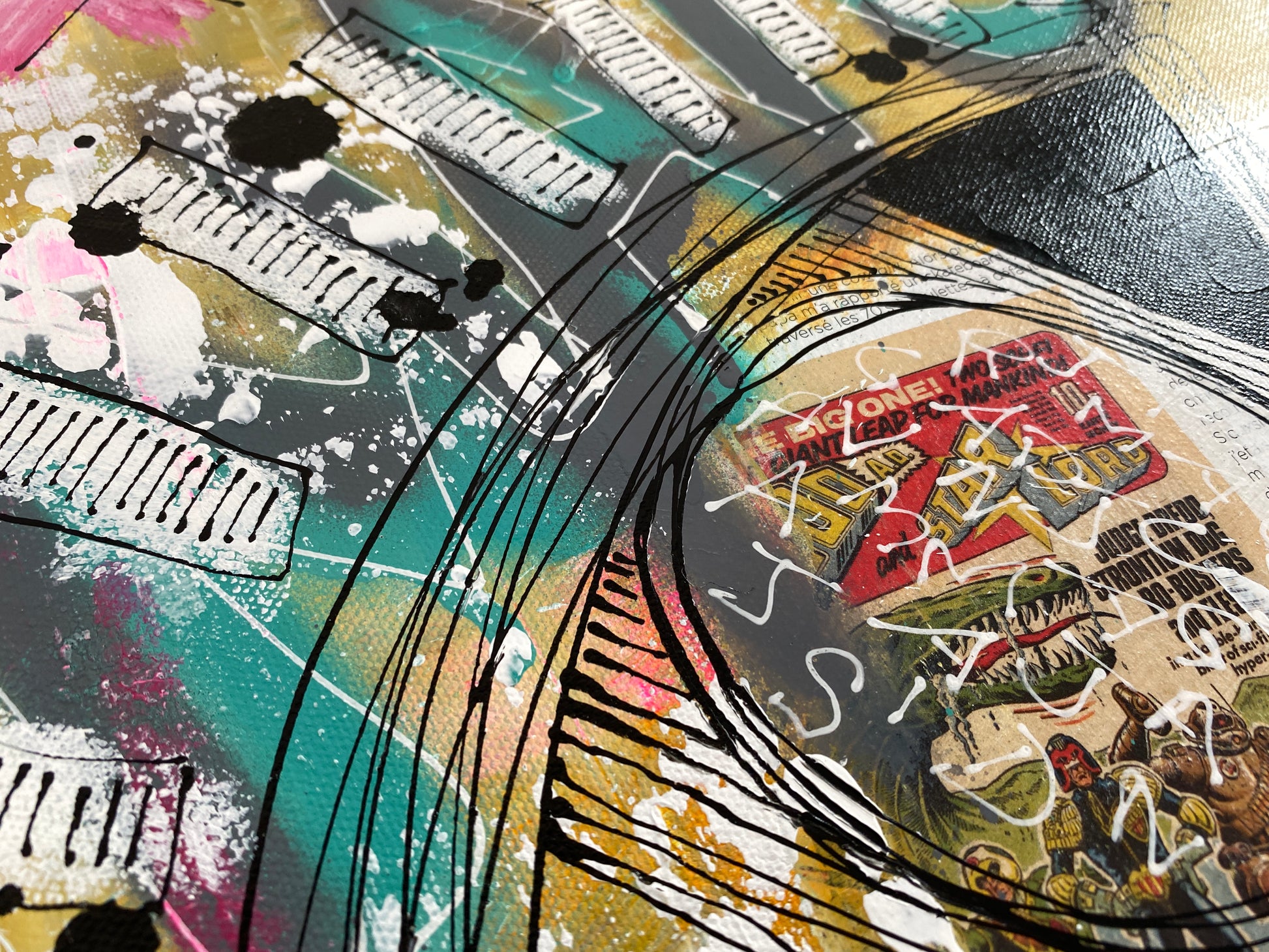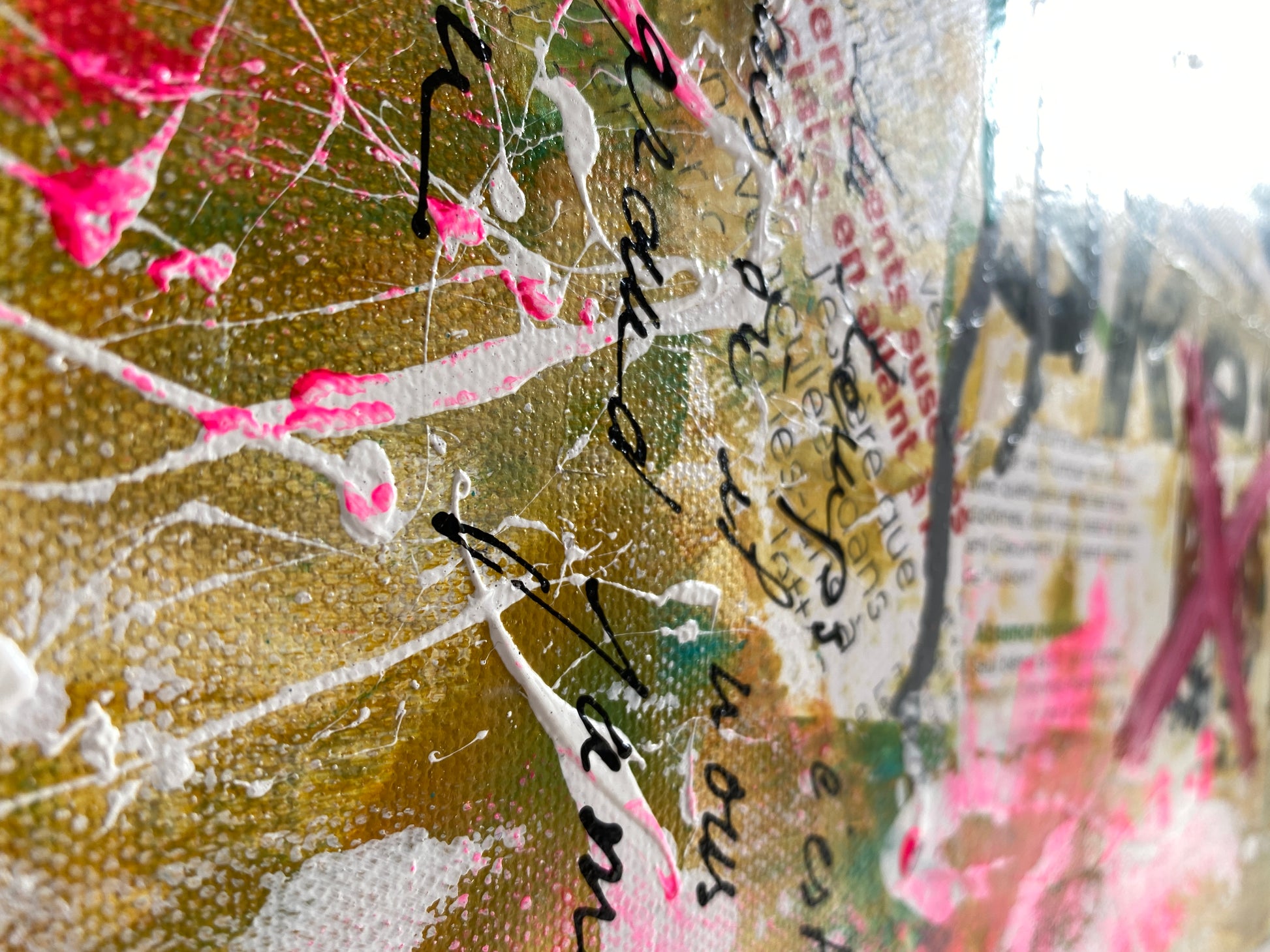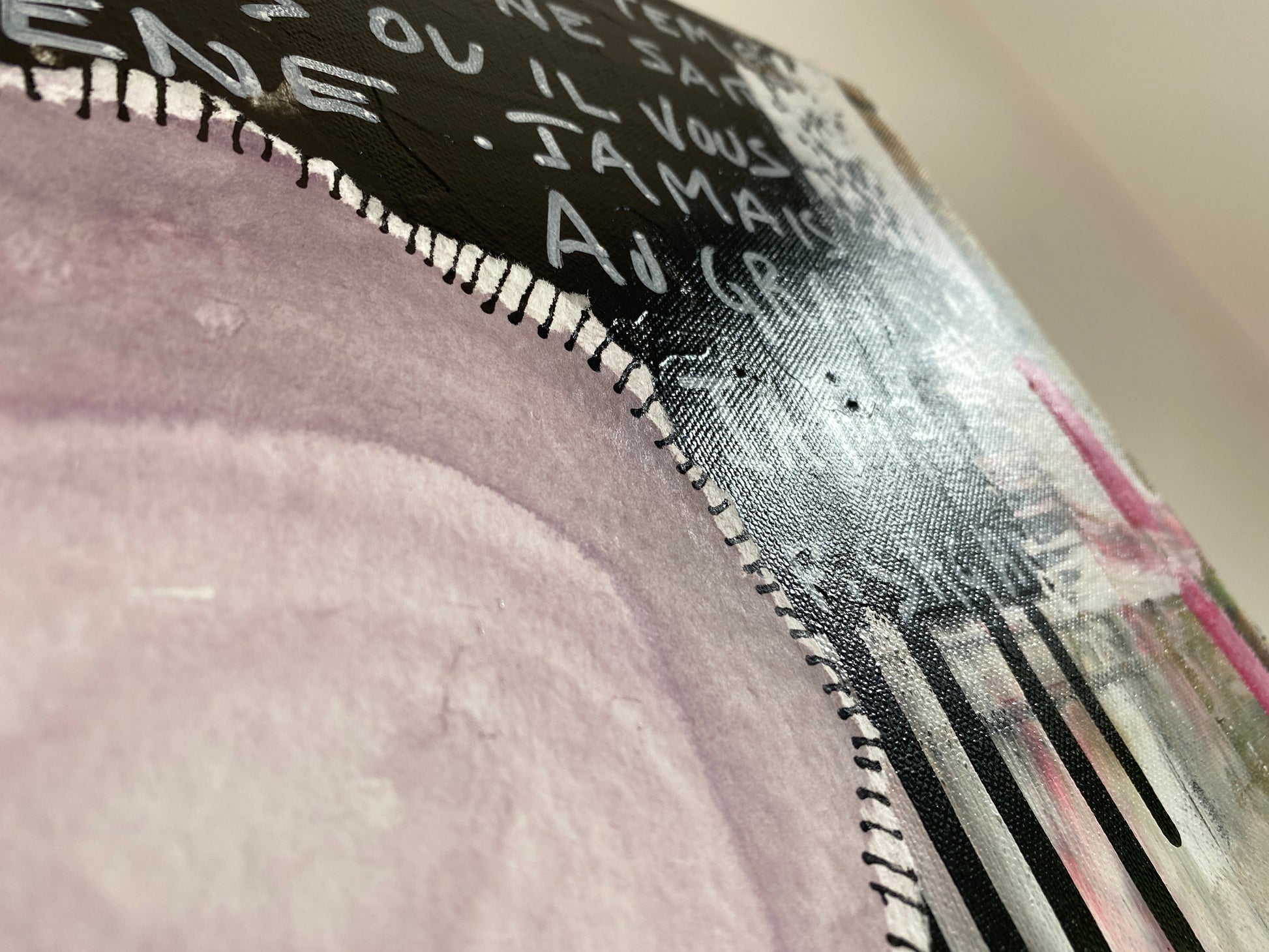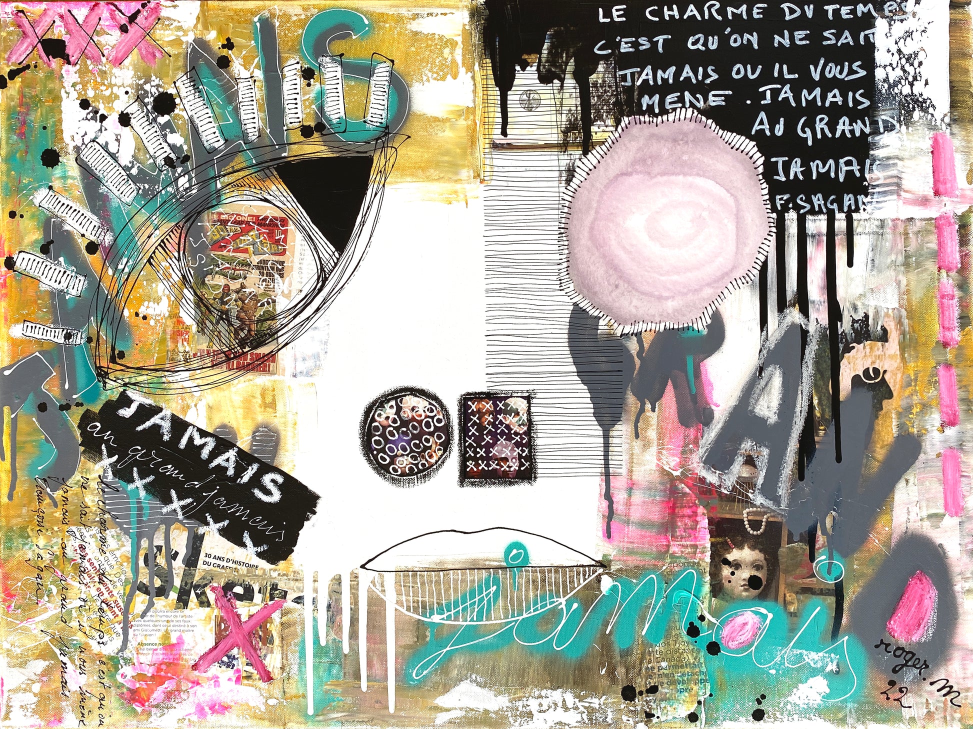 Portrait d'inspiration Street Art, suggéré que l'on devine dans les mots de Françoise Sagan : " Le charme du temps c'est qu'on ne sait jamais où il nous mène. Jamais au grand jamais " Chaque élément et chaque texture se conjuguent pour capturer l'essence du moment, incarnant l'idée que la destination est souvent incertaine, mais toujours pleine de couleur et de vie. Ce tableau est un voyage visuel vibrant, proposant une réflexion sur les surprises et les découvertes de la vie. Il invite à embrasser l'inconnu avec passion et optimisme.