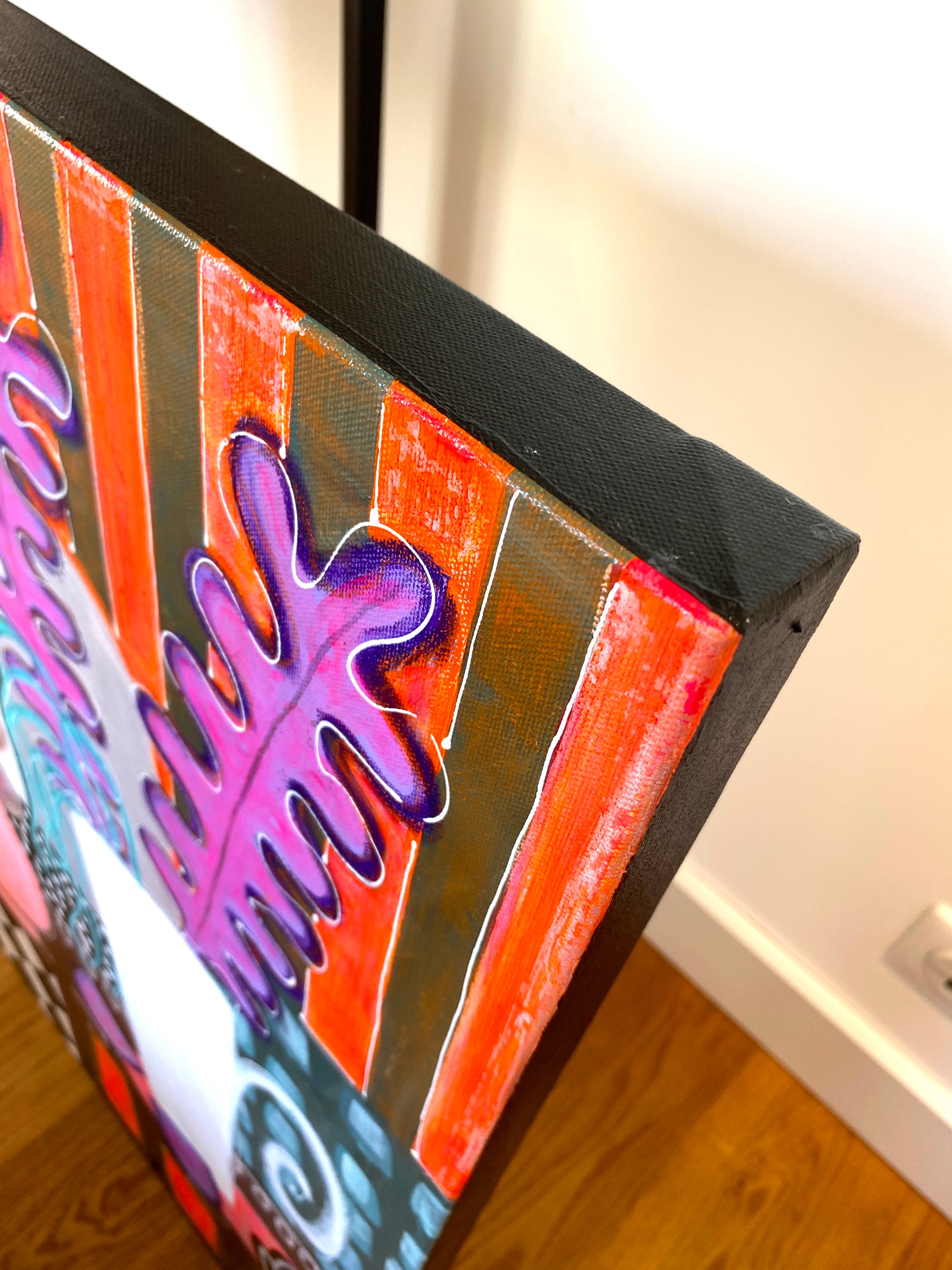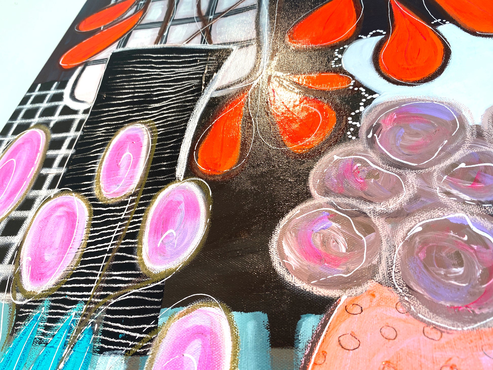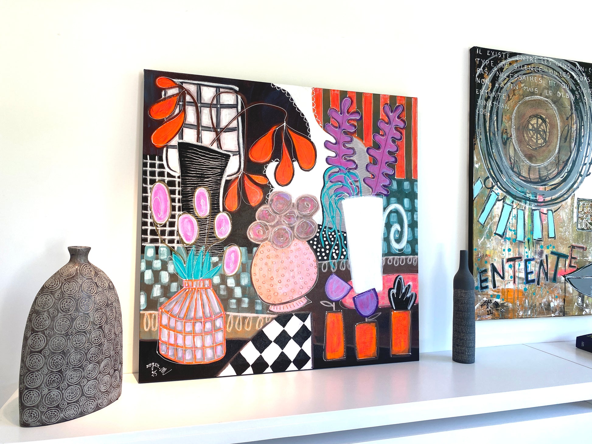 Dans la serre d'Adèle, les vases aux formes variées, placés sur une surface à motifs géométriques, se distinguent par des couleurs éclatantes telles que le rose, le violet et l'orange. Des traits noirs et blancs apportent une structure contrastée, évoquant une harmonie audacieuse entre chaos et organisation. Les motifs floraux stylisés, avec leurs formes exagérées et leurs tons ludiques, insufflent une énergie vivante et contemporaine à l'ensemble. Les arrière-plans à effets de damier et de spirales ajoutent une profondeur hypnotique. Cette composition réussit à fusionner l'art abstrait et le style décoratif, créant une œuvre captivante et unique qui réinvente la tradition classique avec modernité et éclat.