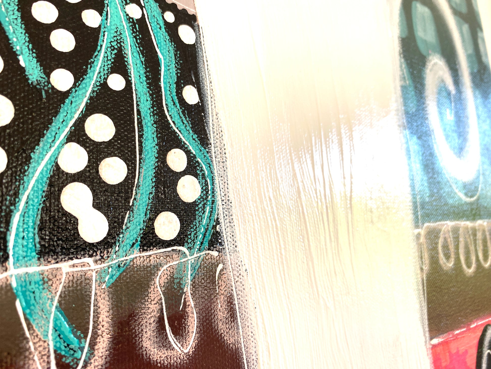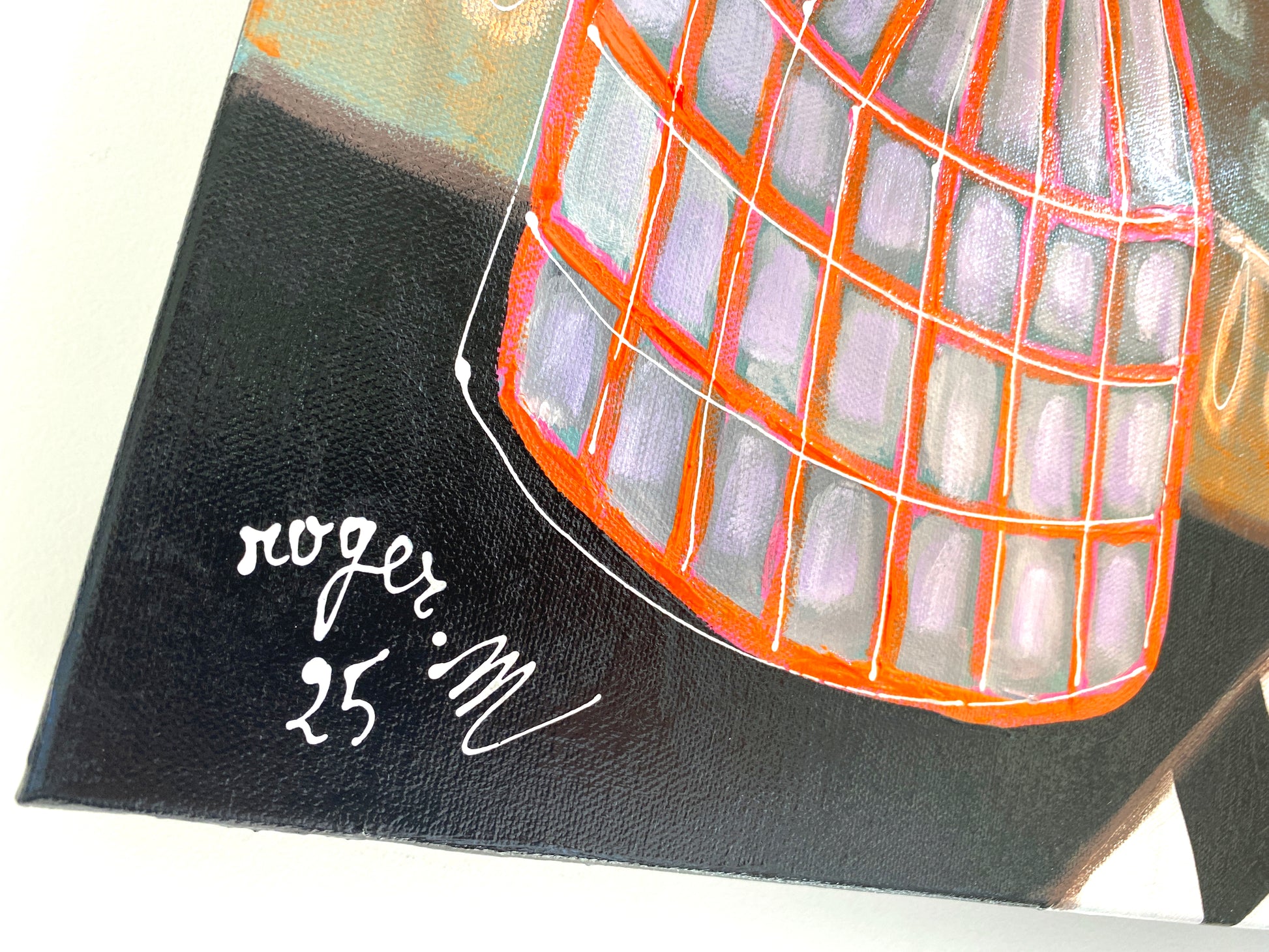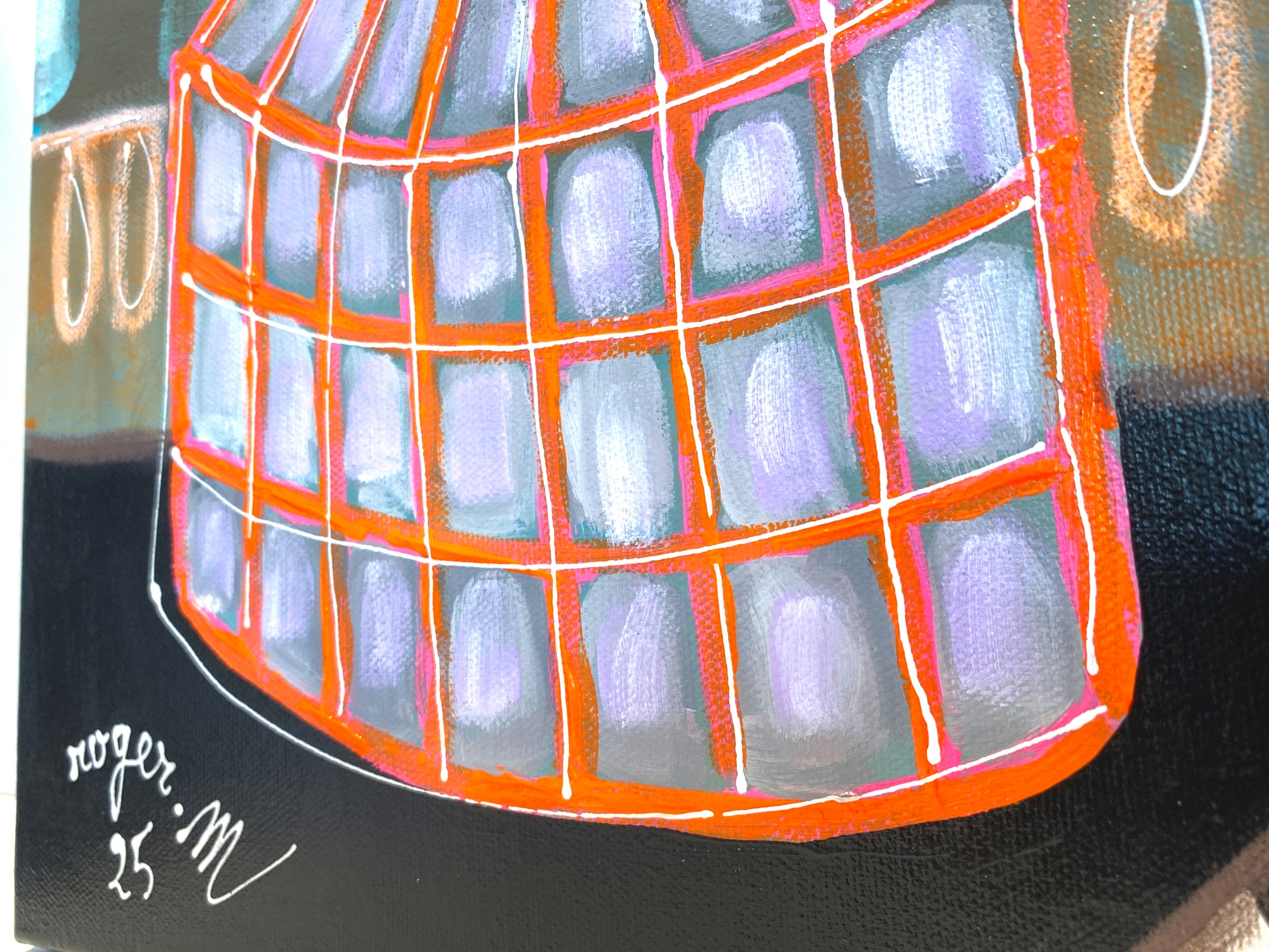 Dans la serre d'Adèle, les vases aux formes variées, placés sur une surface à motifs géométriques, se distinguent par des couleurs éclatantes telles que le rose, le violet et l'orange. Des traits noirs et blancs apportent une structure contrastée, évoquant une harmonie audacieuse entre chaos et organisation. Les motifs floraux stylisés, avec leurs formes exagérées et leurs tons ludiques, insufflent une énergie vivante et contemporaine à l'ensemble. Les arrière-plans à effets de damier et de spirales ajoutent une profondeur hypnotique. Cette composition réussit à fusionner l'art abstrait et le style décoratif, créant une œuvre captivante et unique qui réinvente la tradition classique avec modernité et éclat.