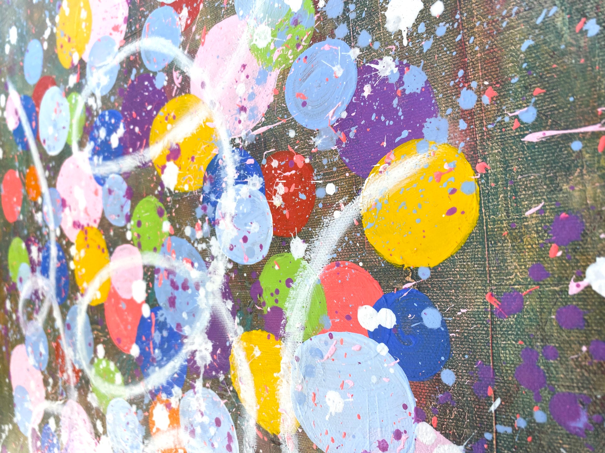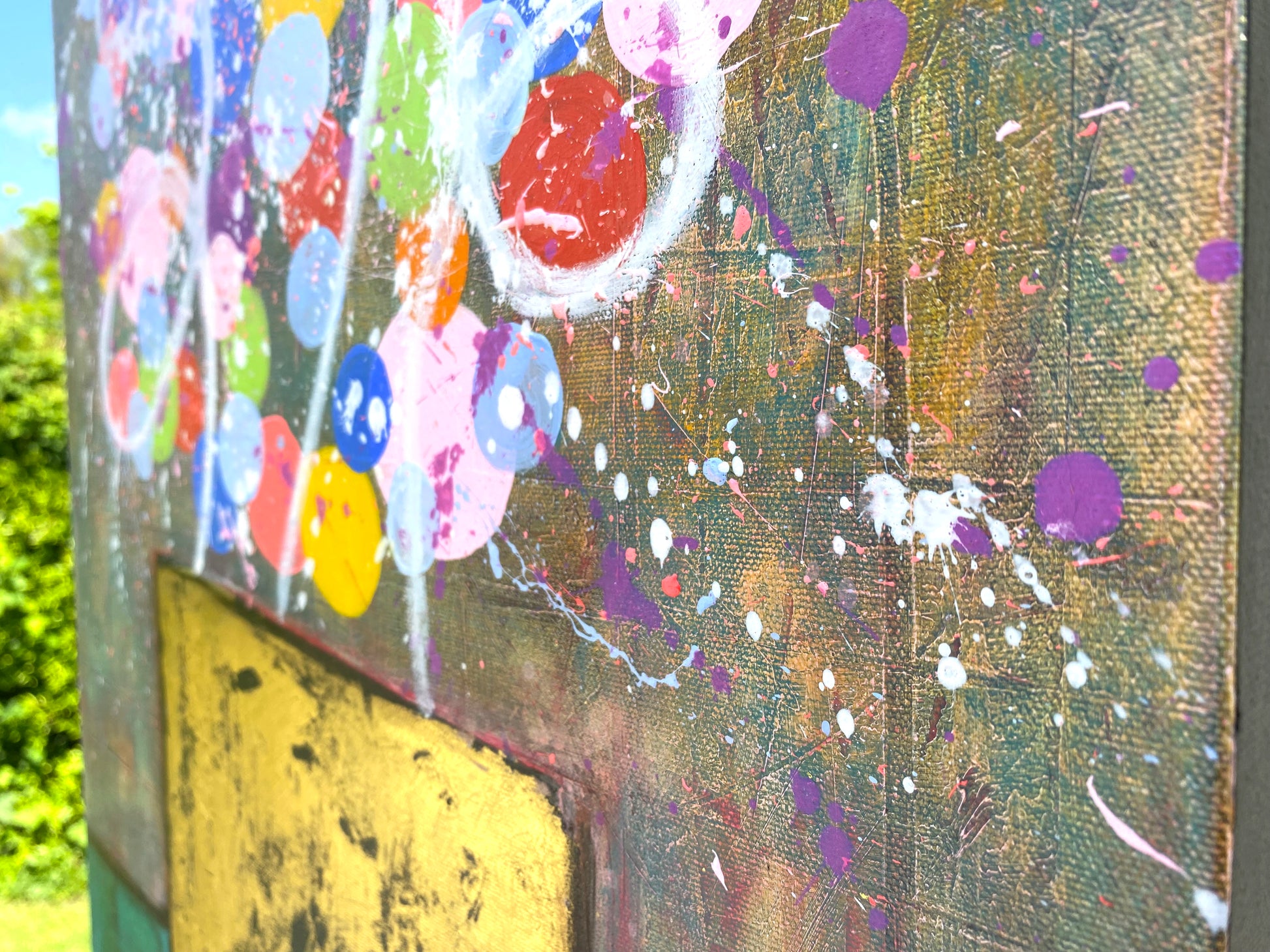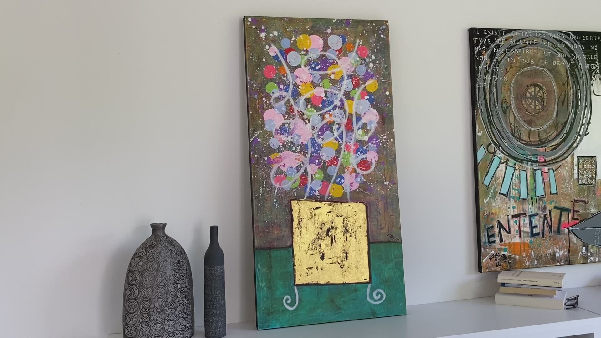 Il était là dans le hall du Grand Hôtel, emplissant tout l'espace de ses couleurs joyeuses dans son vase doré. Le tableau repose sur un contraste saisissant entre la base et le bouquet. Le vase, un carré d'or texturé aux accents de feuille de métal, apporte une stabilité architecturale et une touche de luxe intemporel. De ce socle rigide s'échappe une profusion de sphères multicolores — rouges vibrants, jaunes solaires et bleus profonds — qui semblent l'éviter dans l'espace.