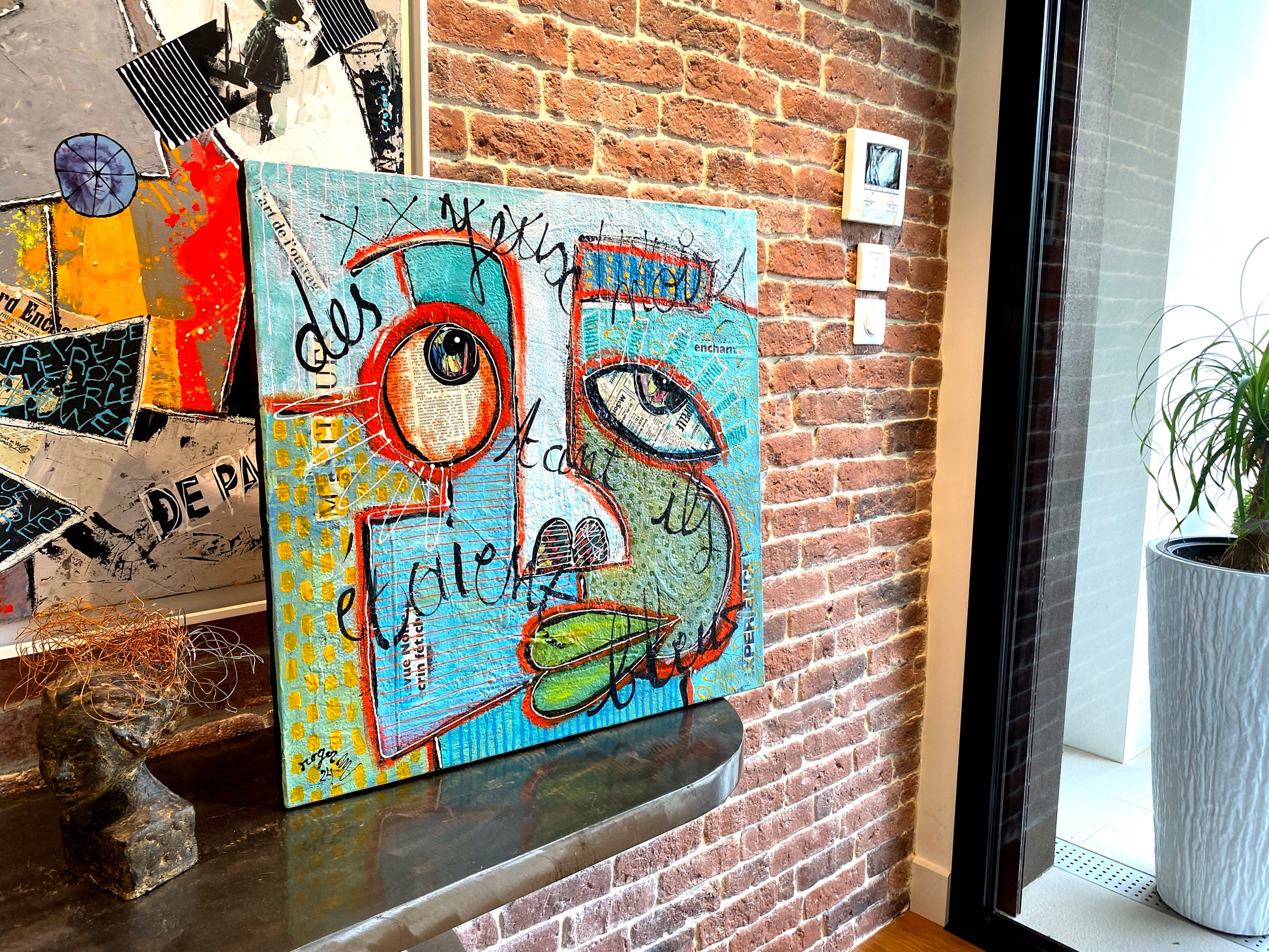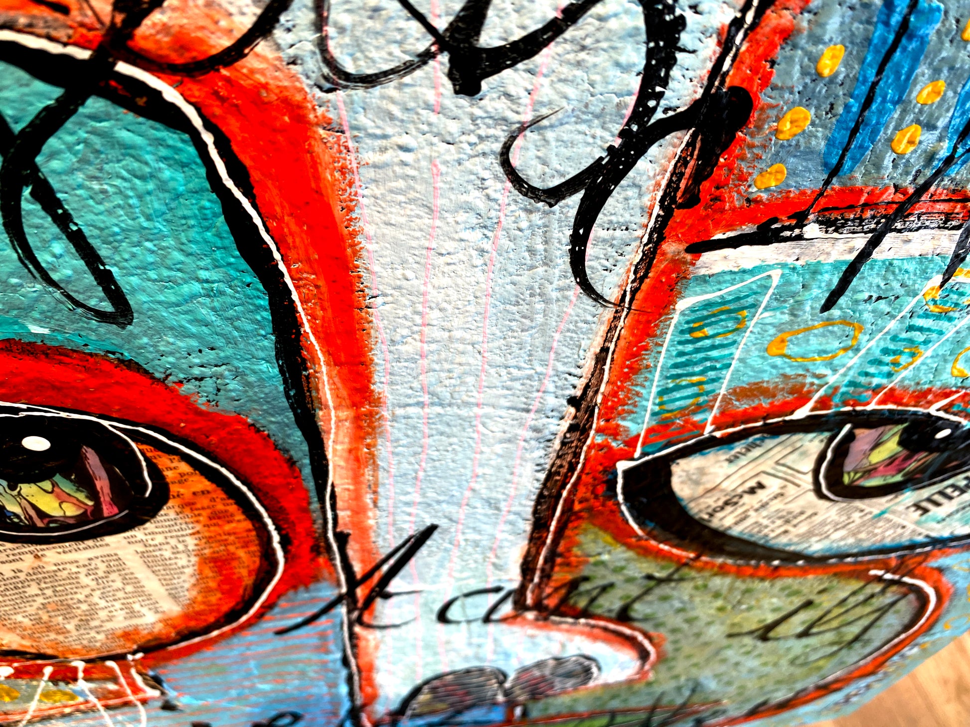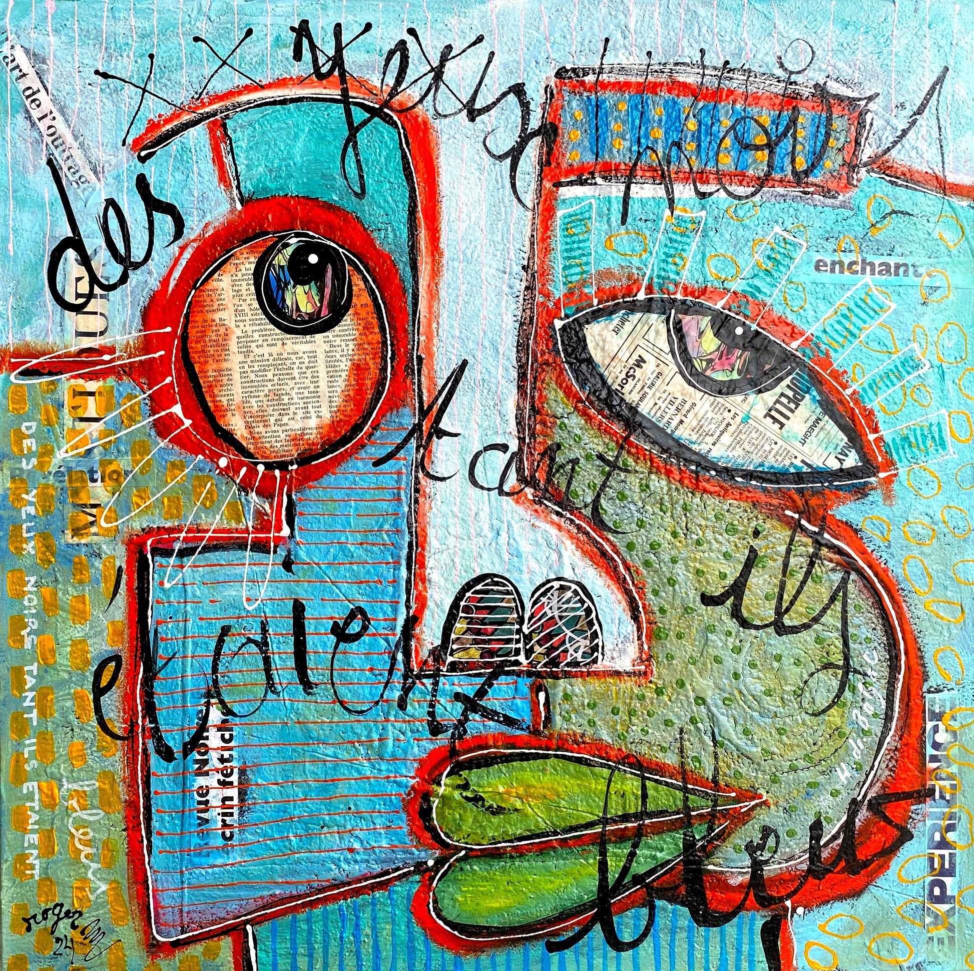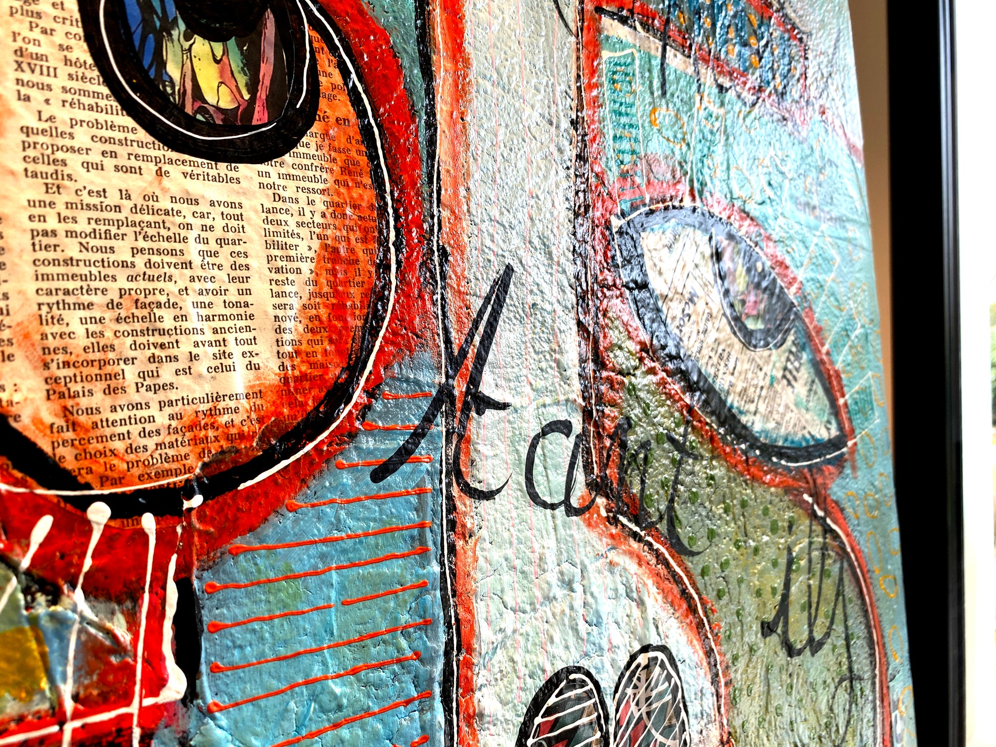Le style de Roger.M est inspiré par les mots et la poésie, qu'elle intègre dans ses œuvres pour créer des portraits imaginaires. L'œuvre dégage une impression de dynamisme et de profondeur émotionnelle à travers ses couleurs, ses textures superposées, et l'interaction entre le figuratif et les éléments abstraits . L'utilisation des collages de texte et des yeux expressifs suggère une exploration de l'identité, du langage intérieur, ou du pouvoir des mots pour façonner la perception. L'ensemble est à la fois brut et poétique.