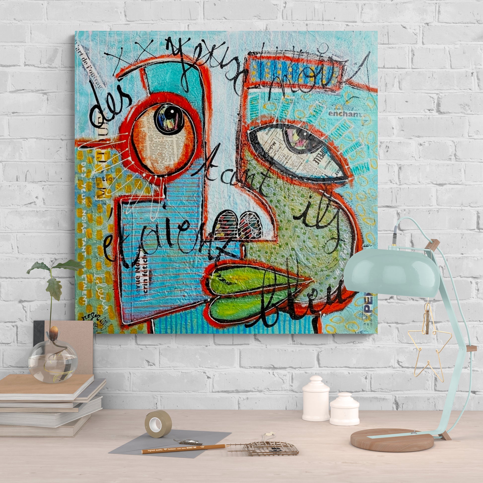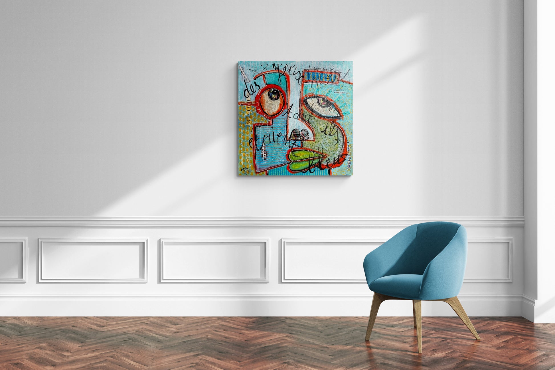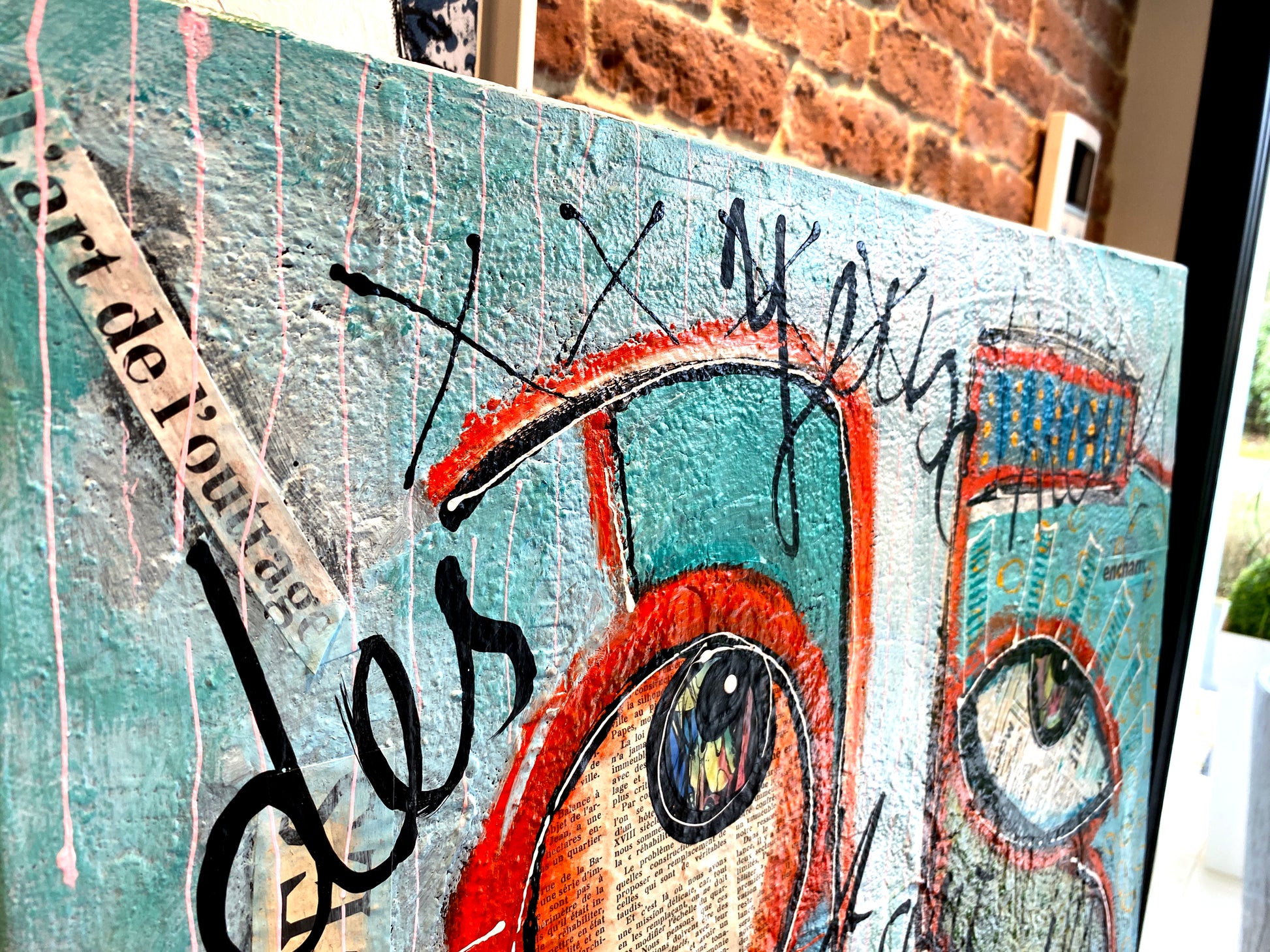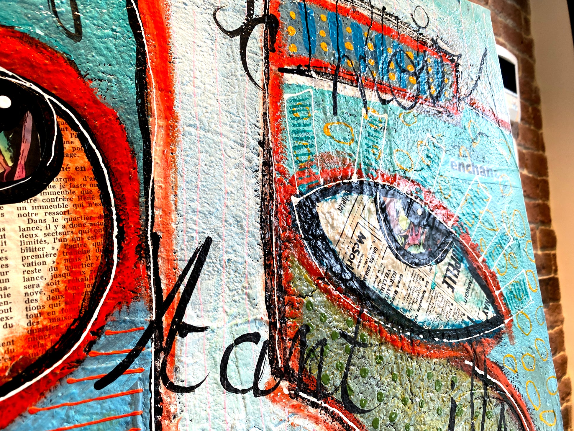 Le style de Roger.M est inspiré par les mots et la poésie, qu'elle intègre dans ses œuvres pour créer des portraits imaginaires. L'œuvre dégage une impression de dynamisme et de profondeur émotionnelle à travers ses couleurs, ses textures superposées, et l'interaction entre le figuratif et les éléments abstraits . L'utilisation des collages de texte et des yeux expressifs suggère une exploration de l'identité, du langage intérieur, ou du pouvoir des mots pour façonner la perception. L'ensemble est à la fois brut et poétique.