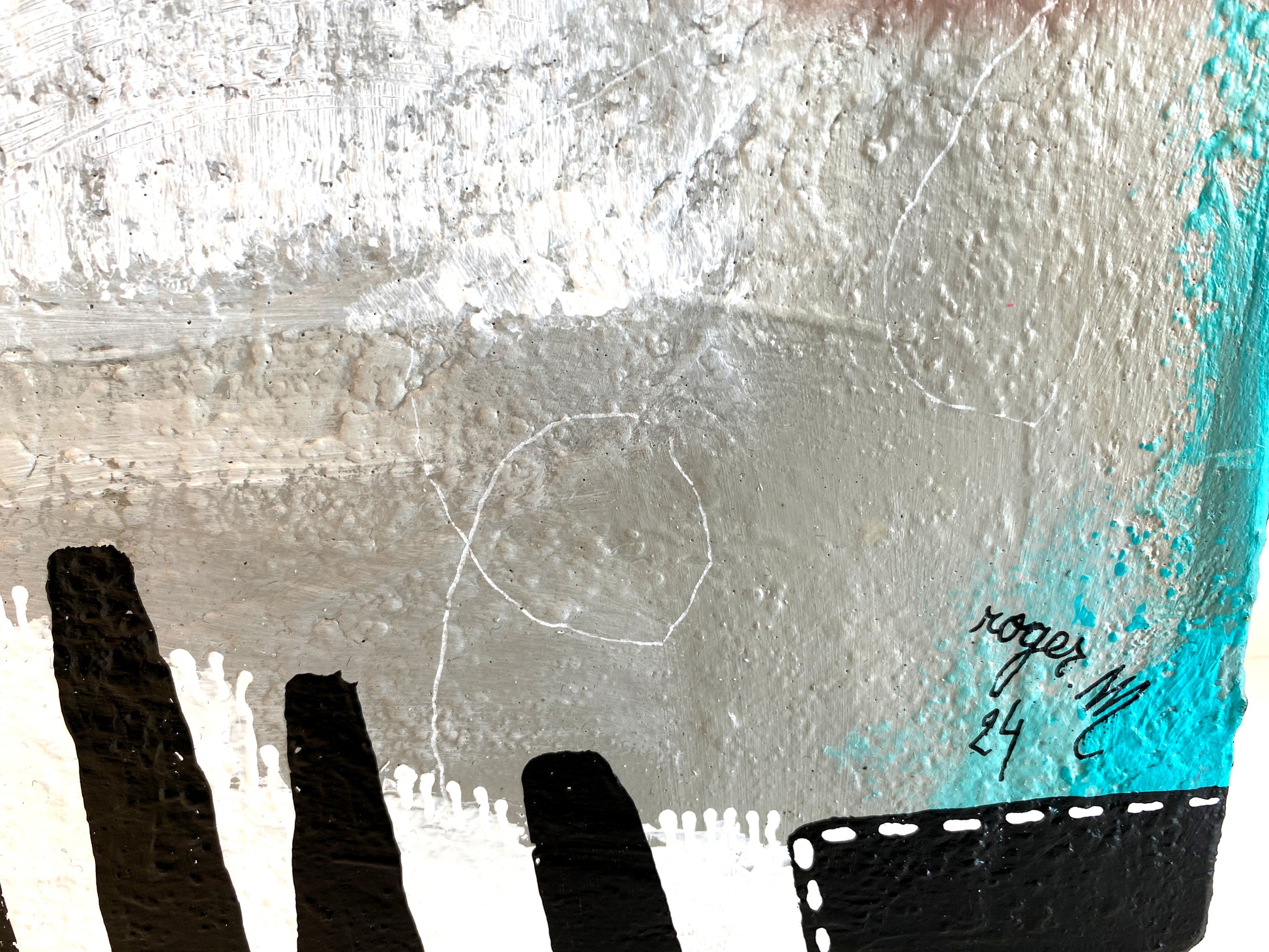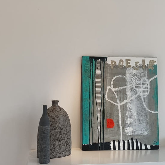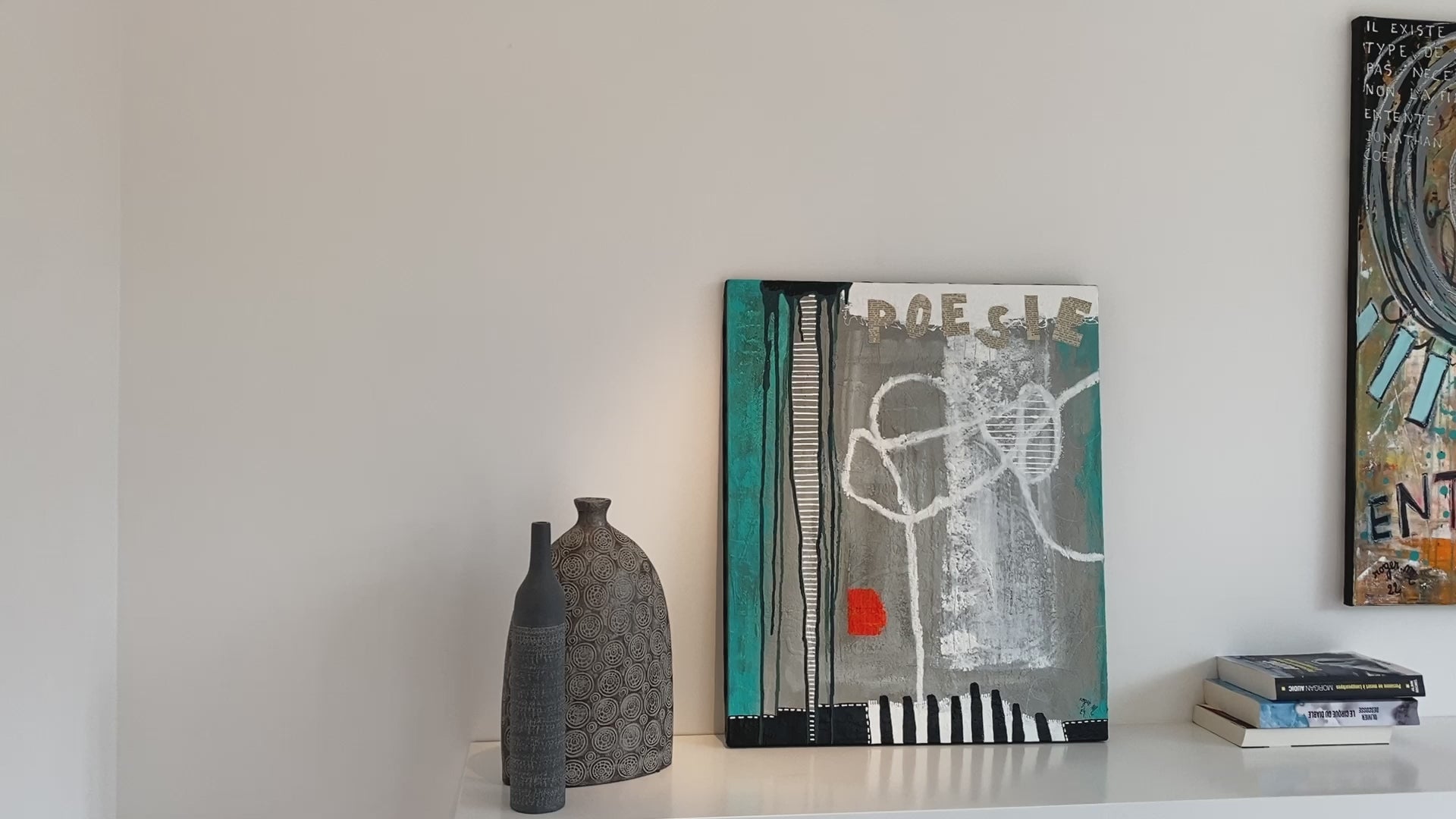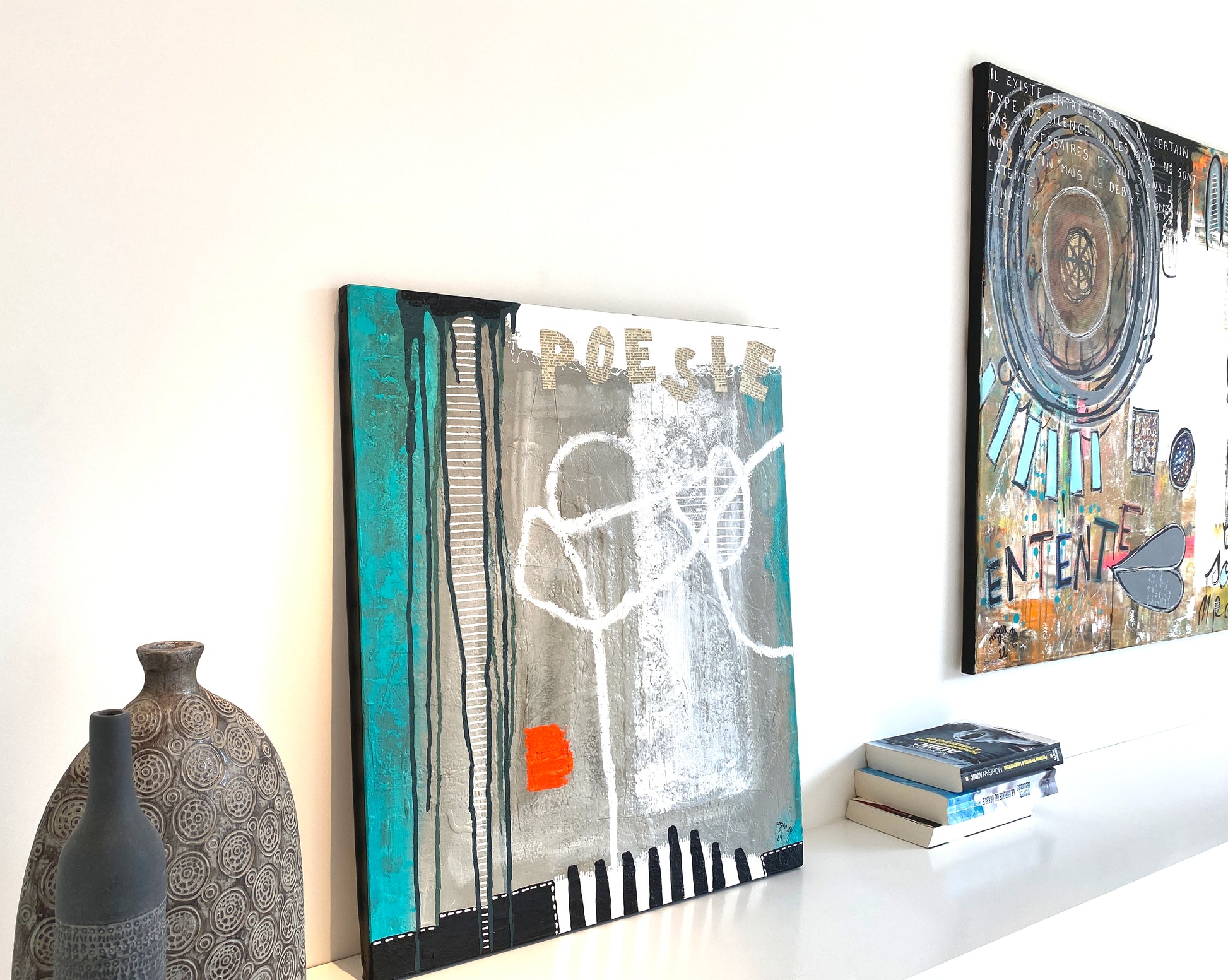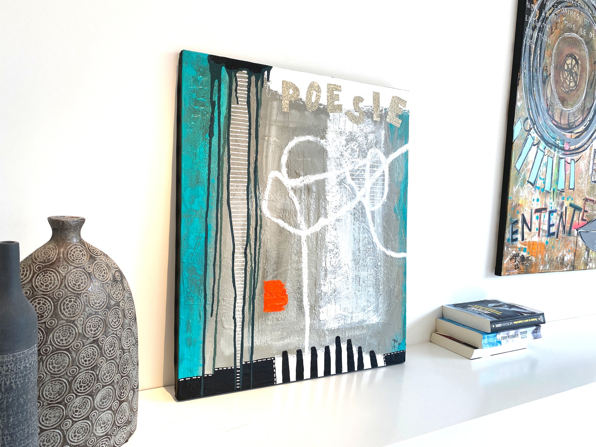 L'œuvre traduit une poésie visuelle où le rythme et la musicalité sont palpables. Le contraste entre le chaos des coulures et la rigueur des lignes crée une tension dynamique. L'abstraction lyrique des traits blancs "écrits" sur le fond texturé semble être le langage de cette "Poésie", un dialogue entre la structure (le piano, les rayures) et l'émotion pure (le geste, la couleur orange explosive). La présence du mot "POÉSIE" invite le spectateur à "lire" l'œuvre non pas comme une image, mais comme une expérience sensorielle et rythmique.