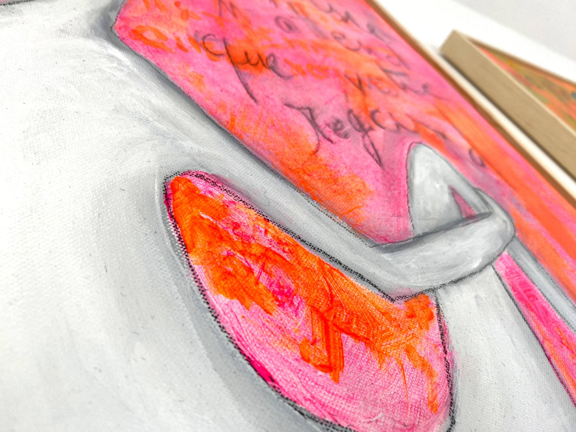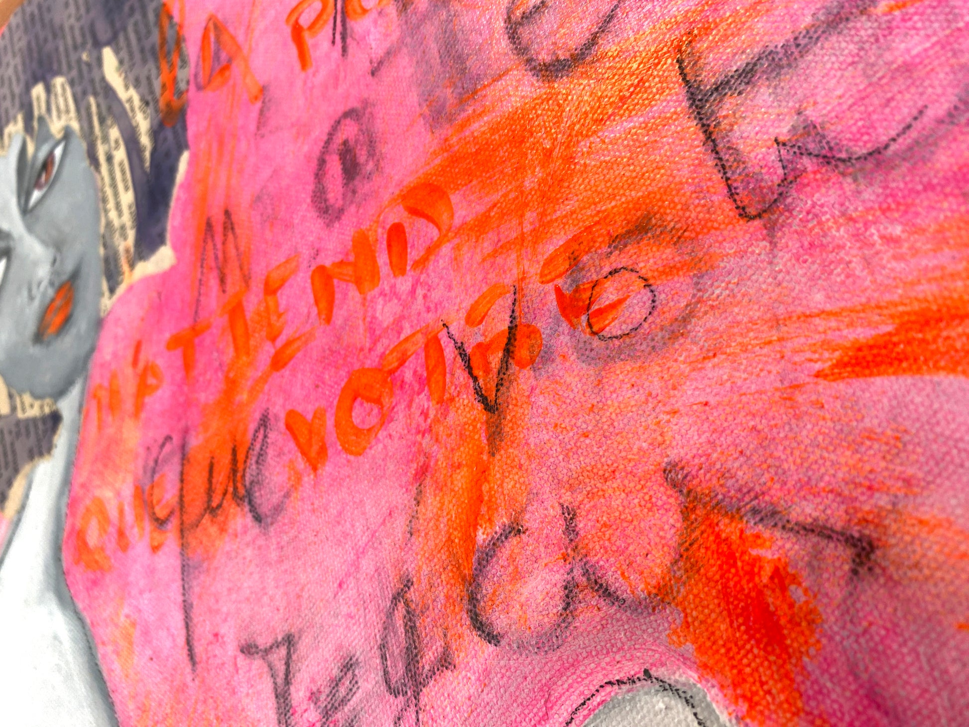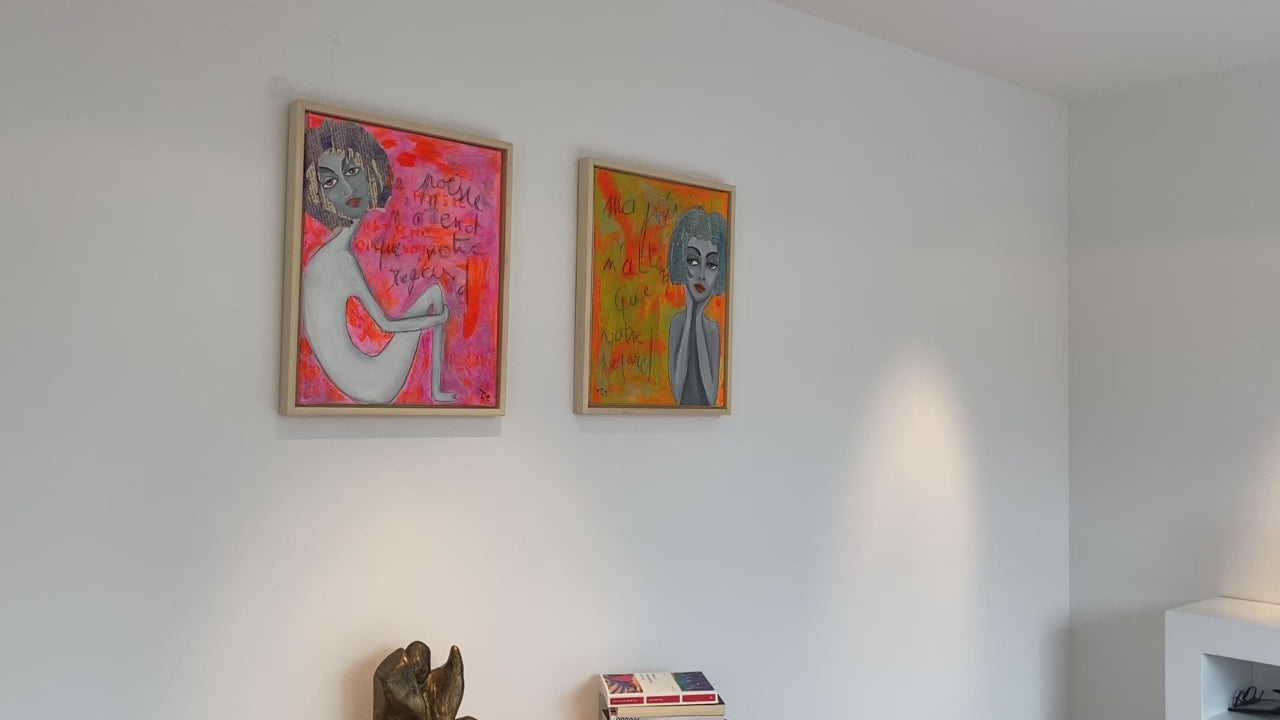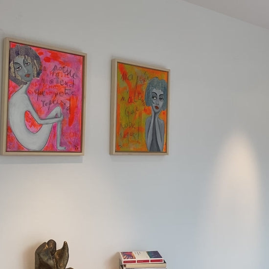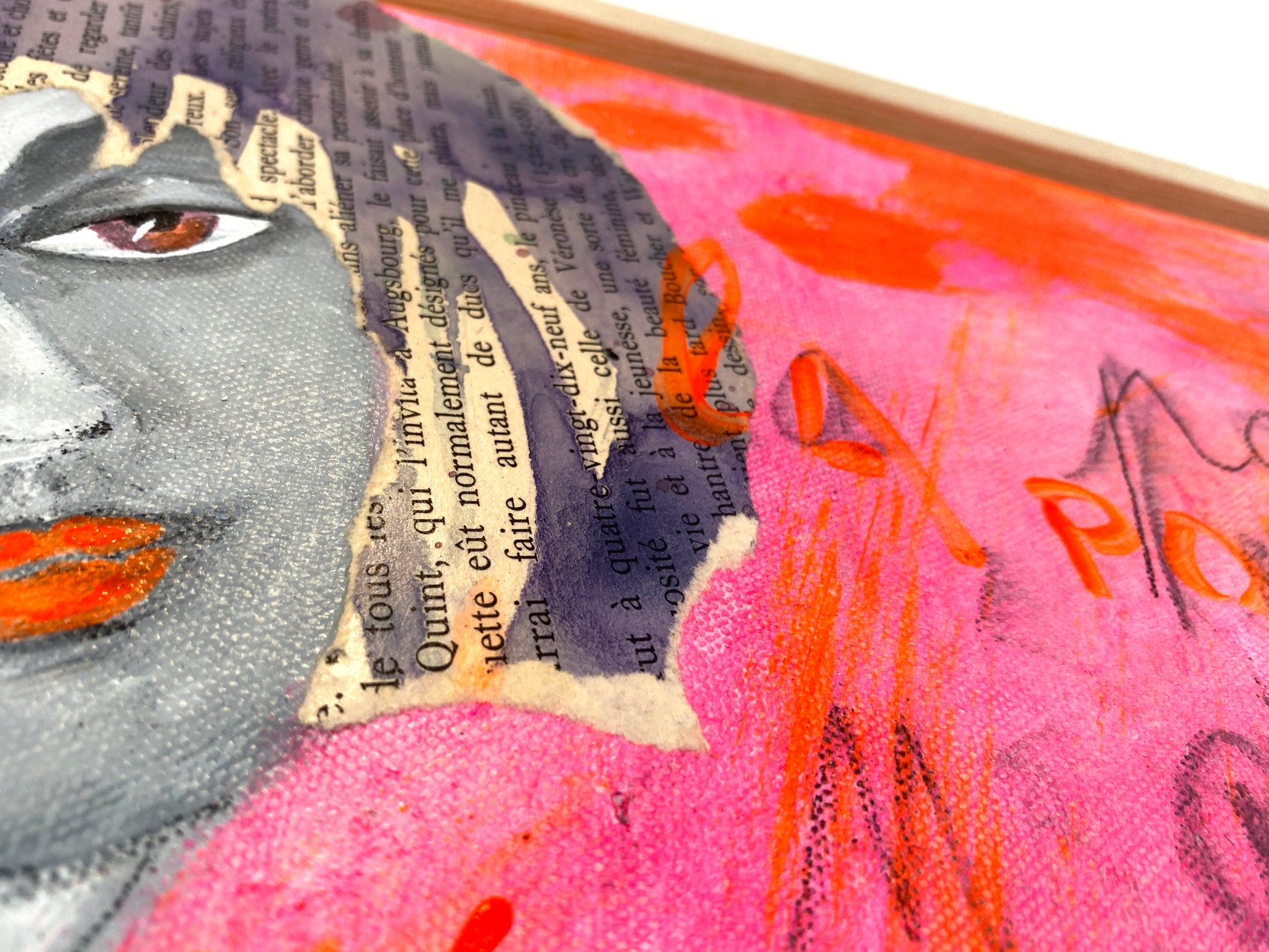 Déclinaison de mes petits personnages fétiches sur fond acidulé - Un hommage à A. Chedid qui disait si joliment "La Poésie n'attend que notre regard" - Dans cette œuvre, j'ai mélangé l'acrylique, le collage, le pastel à l'huile et l'encre pour créer un espace où le figuratif rencontre l'abstrait. Les couleurs vibrantes et les formes naives évoquent une énergie pop-art, tandis que le regard de mon sujet invite à la contemplation. Chaque trait et couleur révèle une passion, une émotion brute. Cette toile est un dialogue entre le spectateur et mon univers artistique, une célébration de la poésie visuelle.