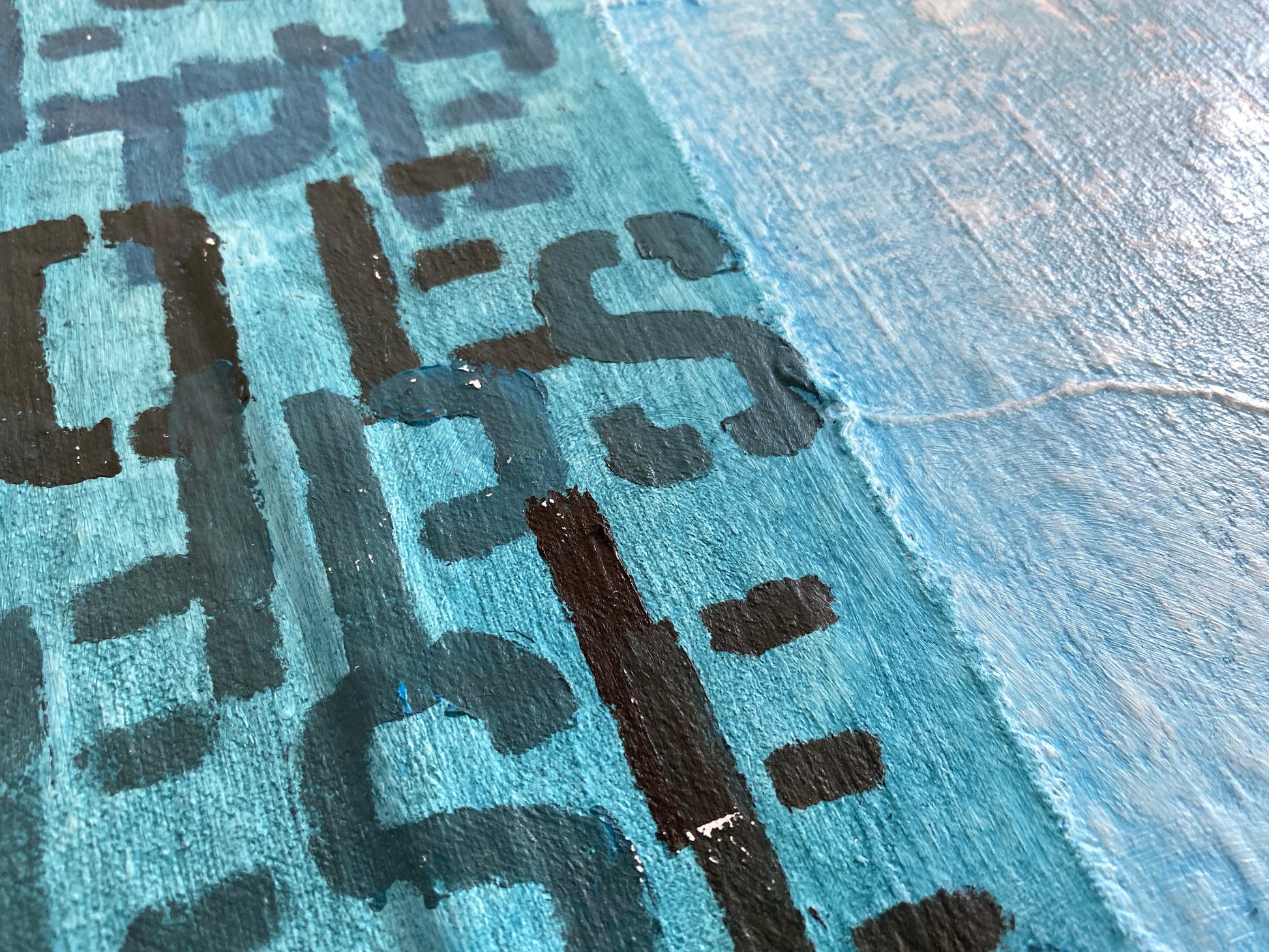 Le visage est décomposé en larges blocs de collages tissus, de couleur et de motifs, typique du style de l'artiste qui incorpore souvent des éléments graphiques et de la "calligraphie".