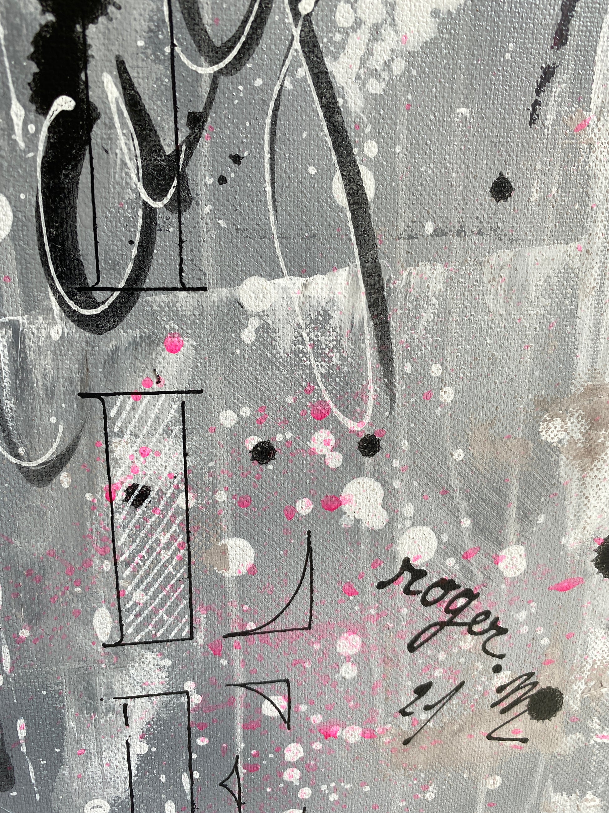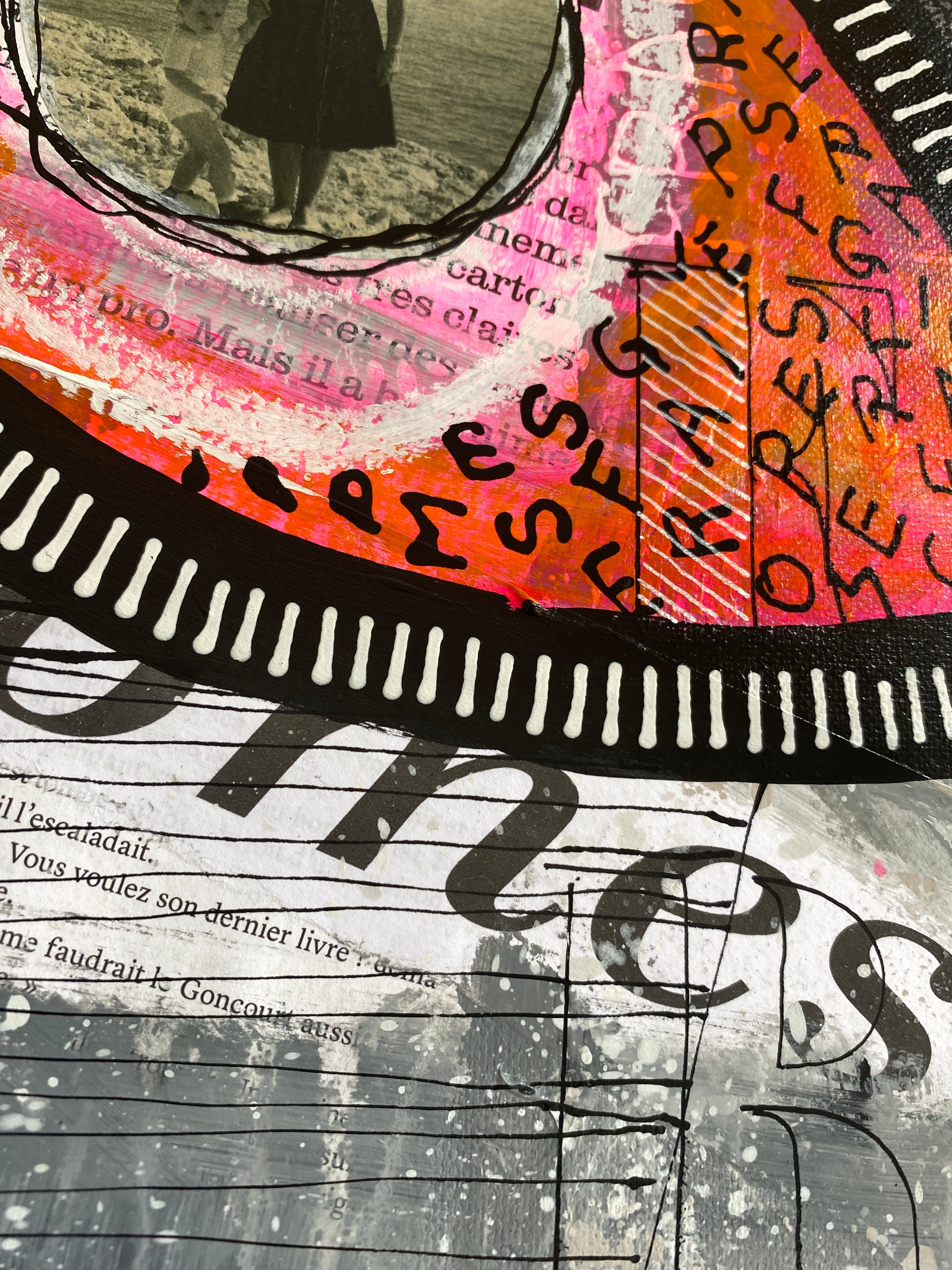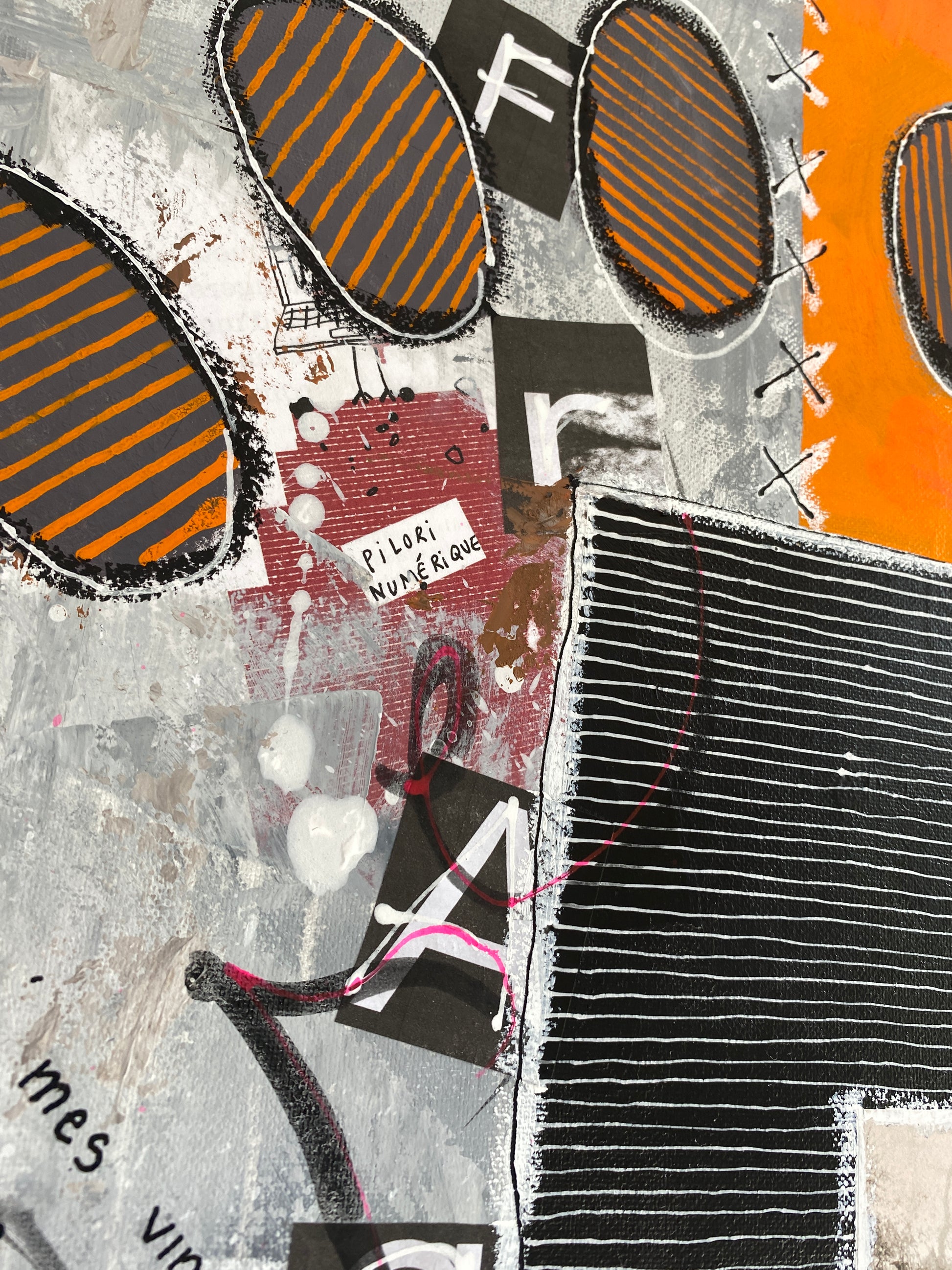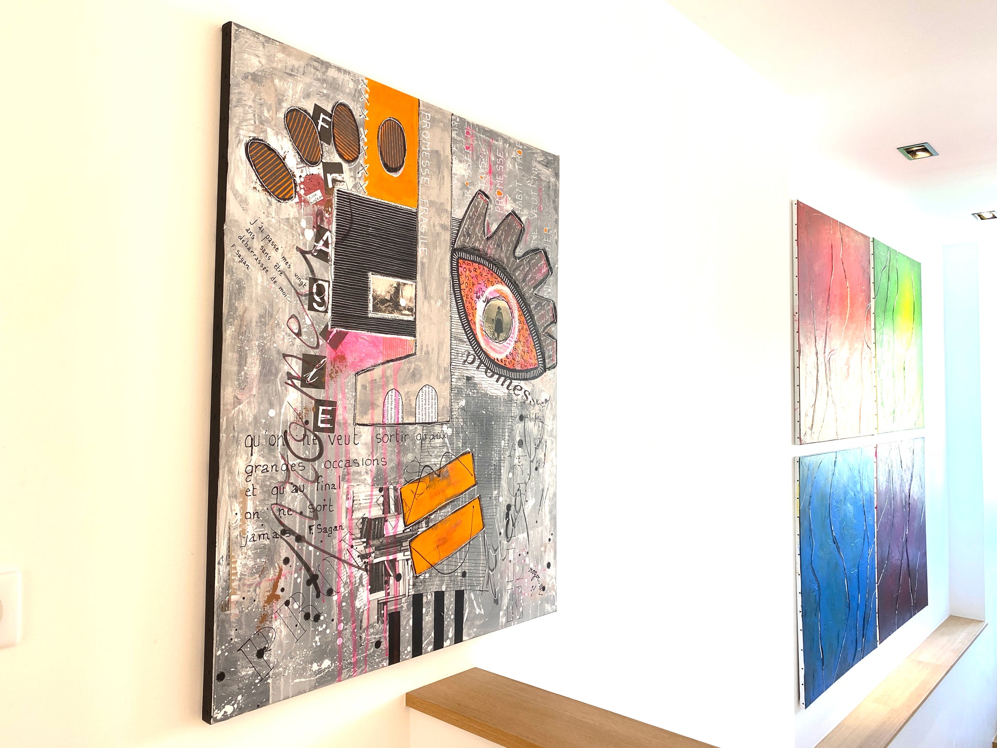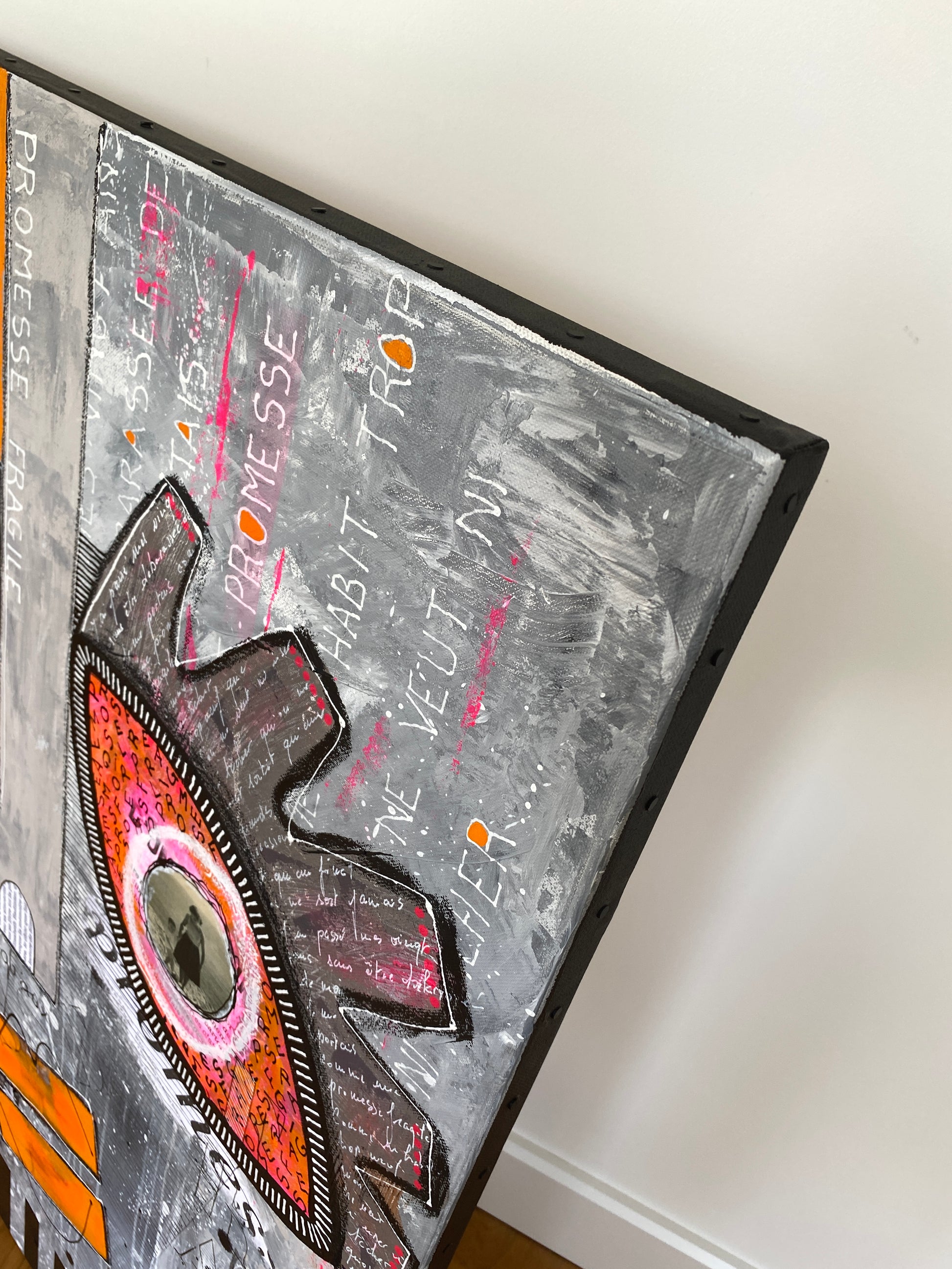 De l'ambiguïté des mots se dessine le portrait. Dans cette oeuvre, j'ai exploré la tension entre l'ordre et le chaos. Les contrastes entre les formes géométriques et les éclats de couleur acrylique reflètent une dynamique vibrante. L'emploi du collage et des pastels à l'huile ajoute une texture qui invite à la contemplation. C'est une célébration de la complexité des émotions humaines, un hommage à la fragilité des promesses et à leur puissance transformative.