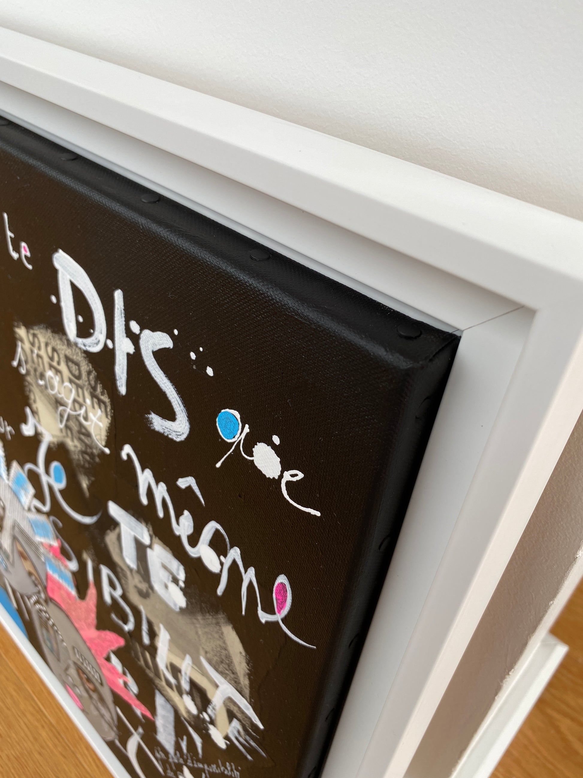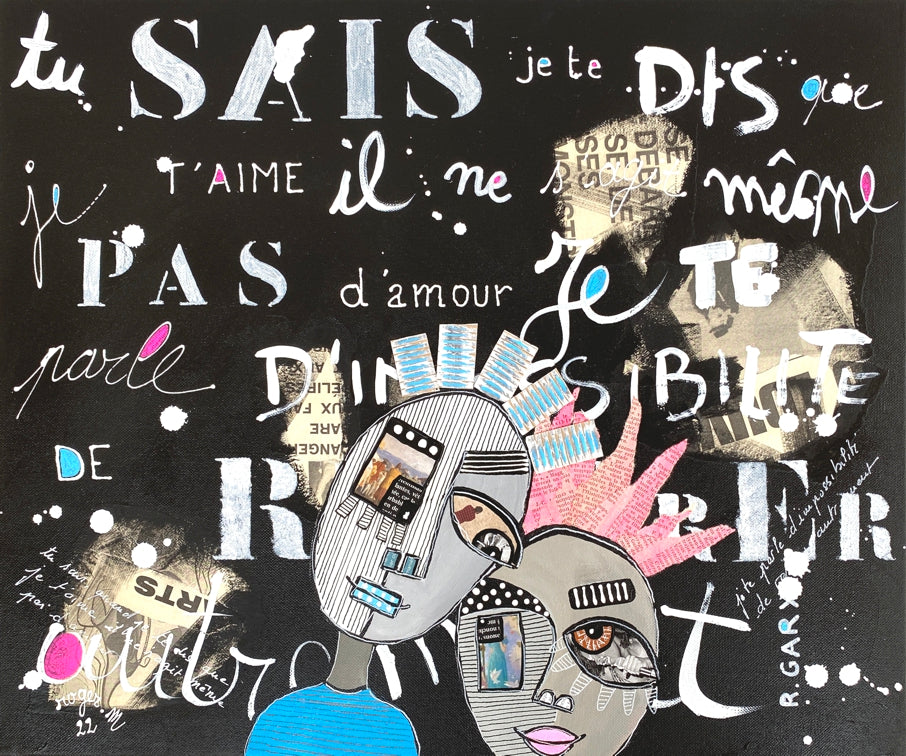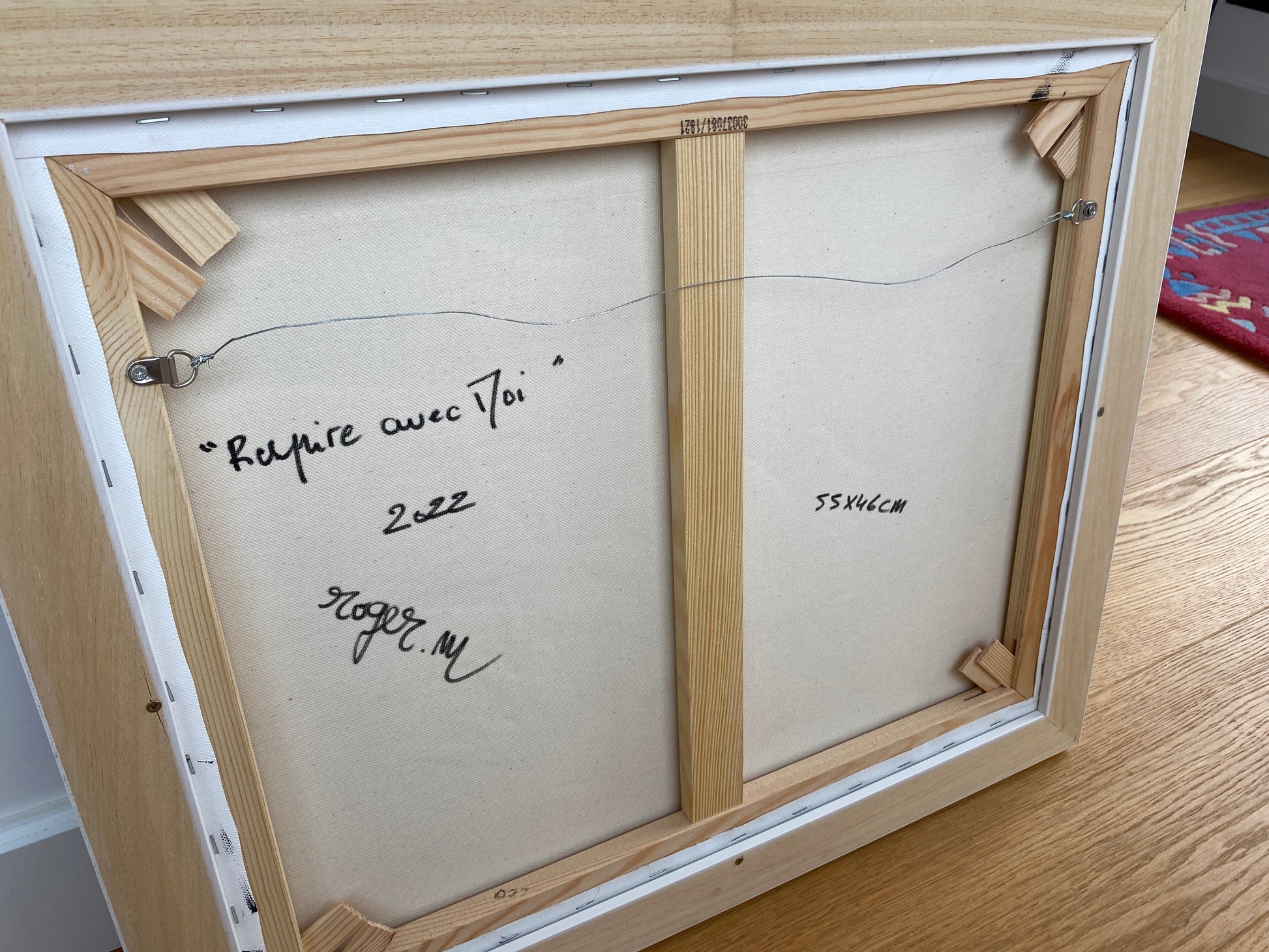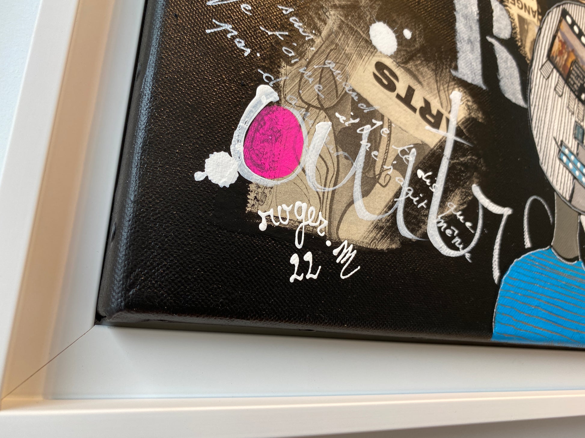 Ce tableau de Roger.M est une œuvre expressive de style Street Art ou Néo-Expressionnisme urbain, qui utilise la force du texte et la technique du collage pour sonder les thèmes de l'identité, de l'amour, et de la difficulté à s'exprimer dans le tumulte du monde moderne. Il invite le spectateur à "respirer" un instant pour décoder ce message personnel et universel.