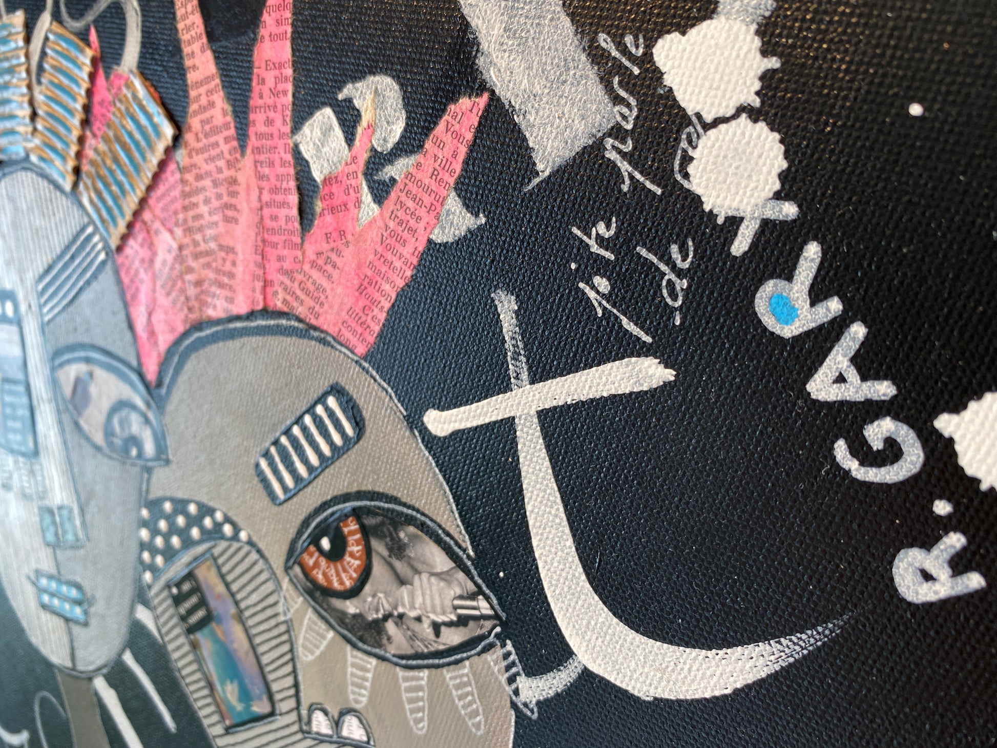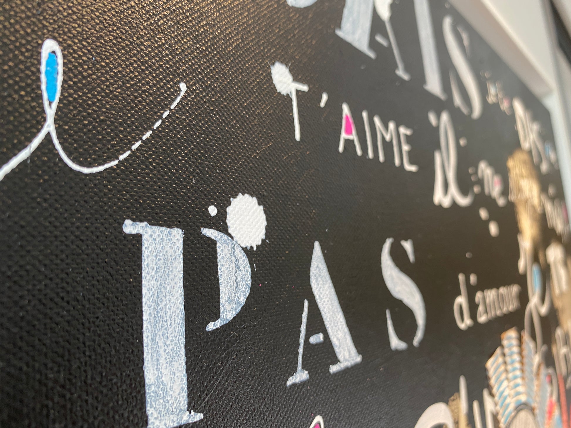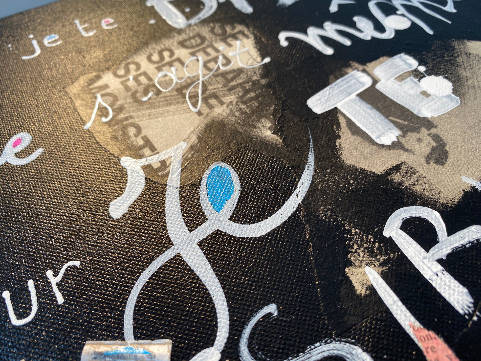 Ce tableau de Roger.M est une œuvre expressive de style Street Art ou Néo-Expressionnisme urbain, qui utilise la force du texte et la technique du collage pour sonder les thèmes de l'identité, de l'amour, et de la difficulté à s'exprimer dans le tumulte du monde moderne. Il invite le spectateur à "respirer" un instant pour décoder ce message personnel et universel.